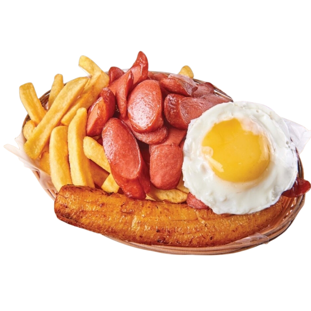 Hamburguesa precocida de carne o pollo, huevo, plátano, lechuga, tomate y papas fritas.