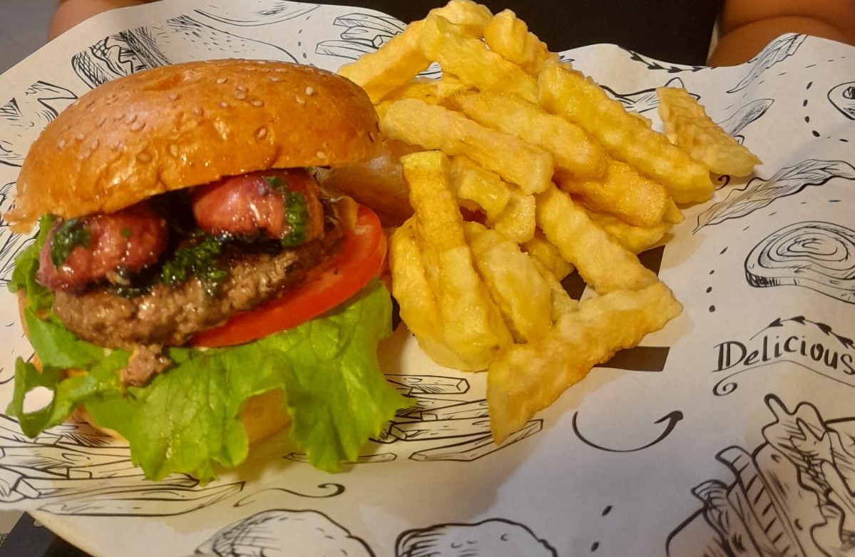 Hamburguesa parrillera artesanal con chimichurri, chorizo, lechuga, tomate y papas fritas.
