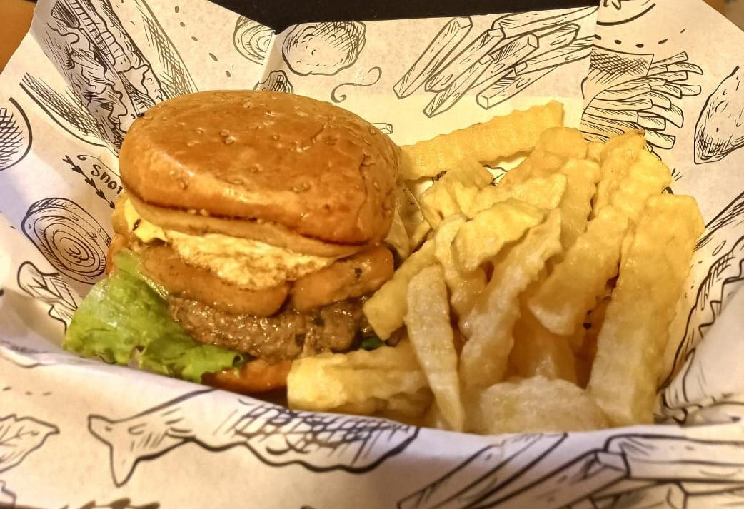 Hamburguesa parrillera artesanal, huevo, queso, lechuga, tomate y papas fritas.