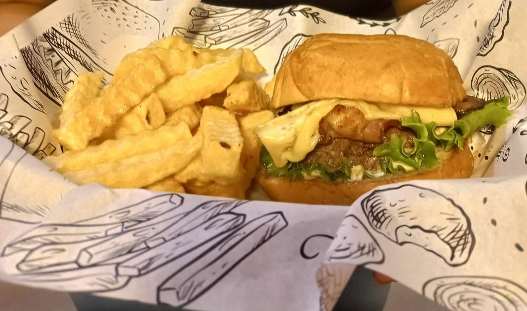 Hamburguesa parrillera artesanal, queso cheddar, bacon, lechuga, tomate y papas fritas.