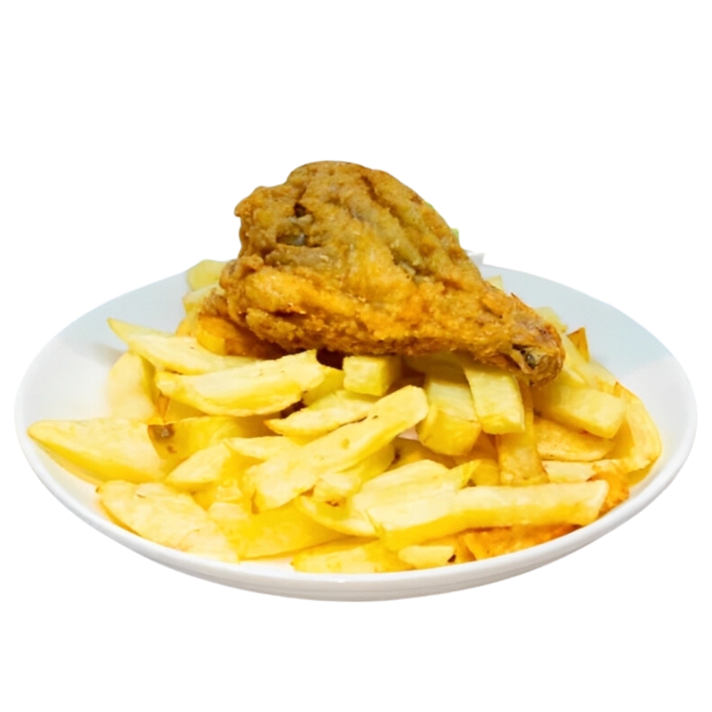 Pierna de pollo crocante, papas fritas y ensalada de lechuga.