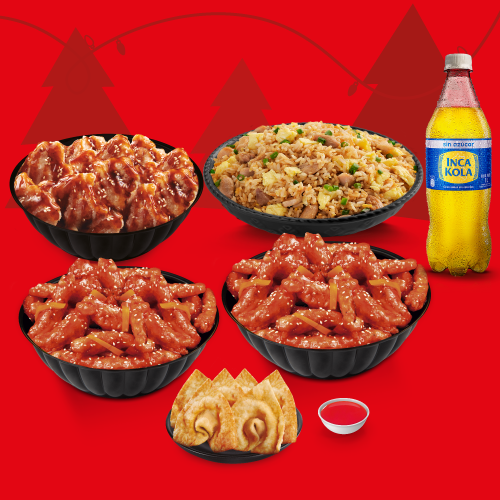 3 Arroz Chaufa de Pollo Familiar, 1 Tallarín Familiar a Elección (Saltado o Taypá), 2 Potajes Familiares a Elección Chi Jau Kay (salado) o Tipakay (dulce), 16 wantanes con salsa tamarindo. ALERT DEL PERU S.A.C. RUC: 20101869947.