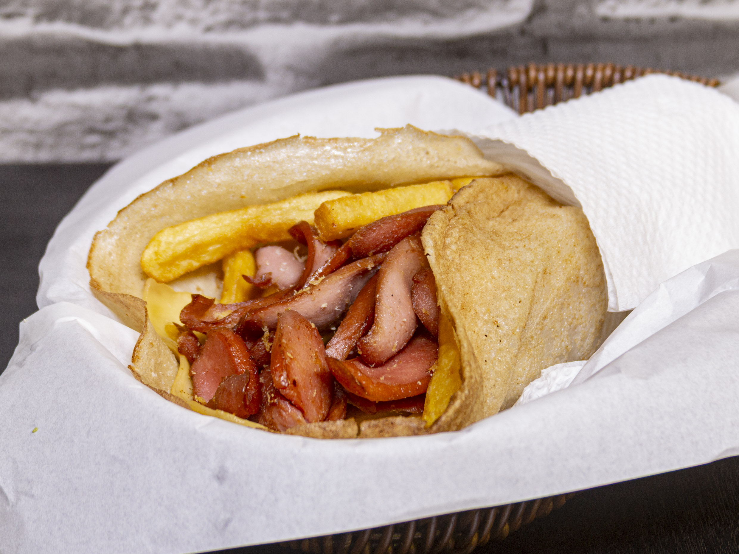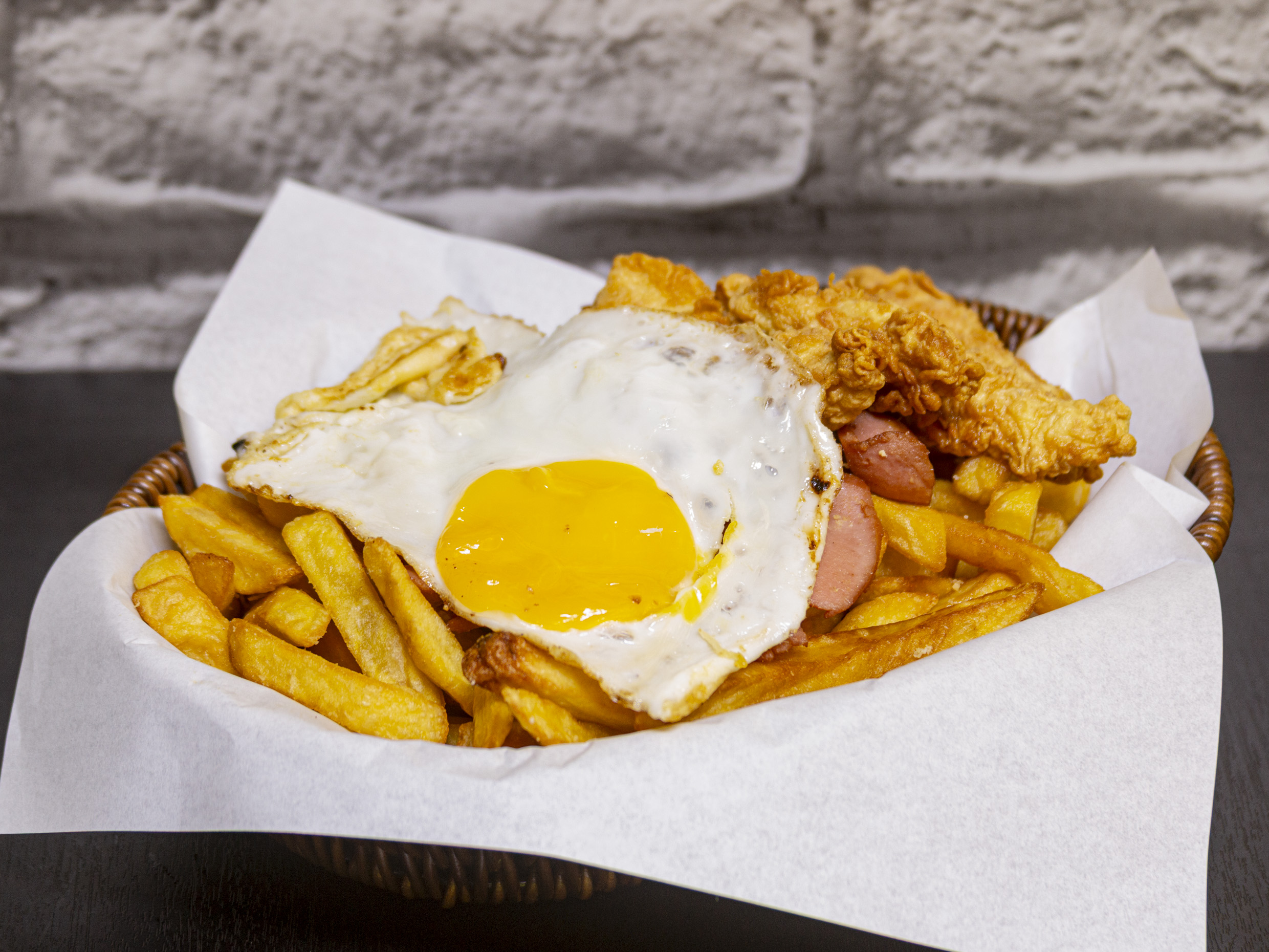 Hot-dog con huevo, chorizo y papas fritas.