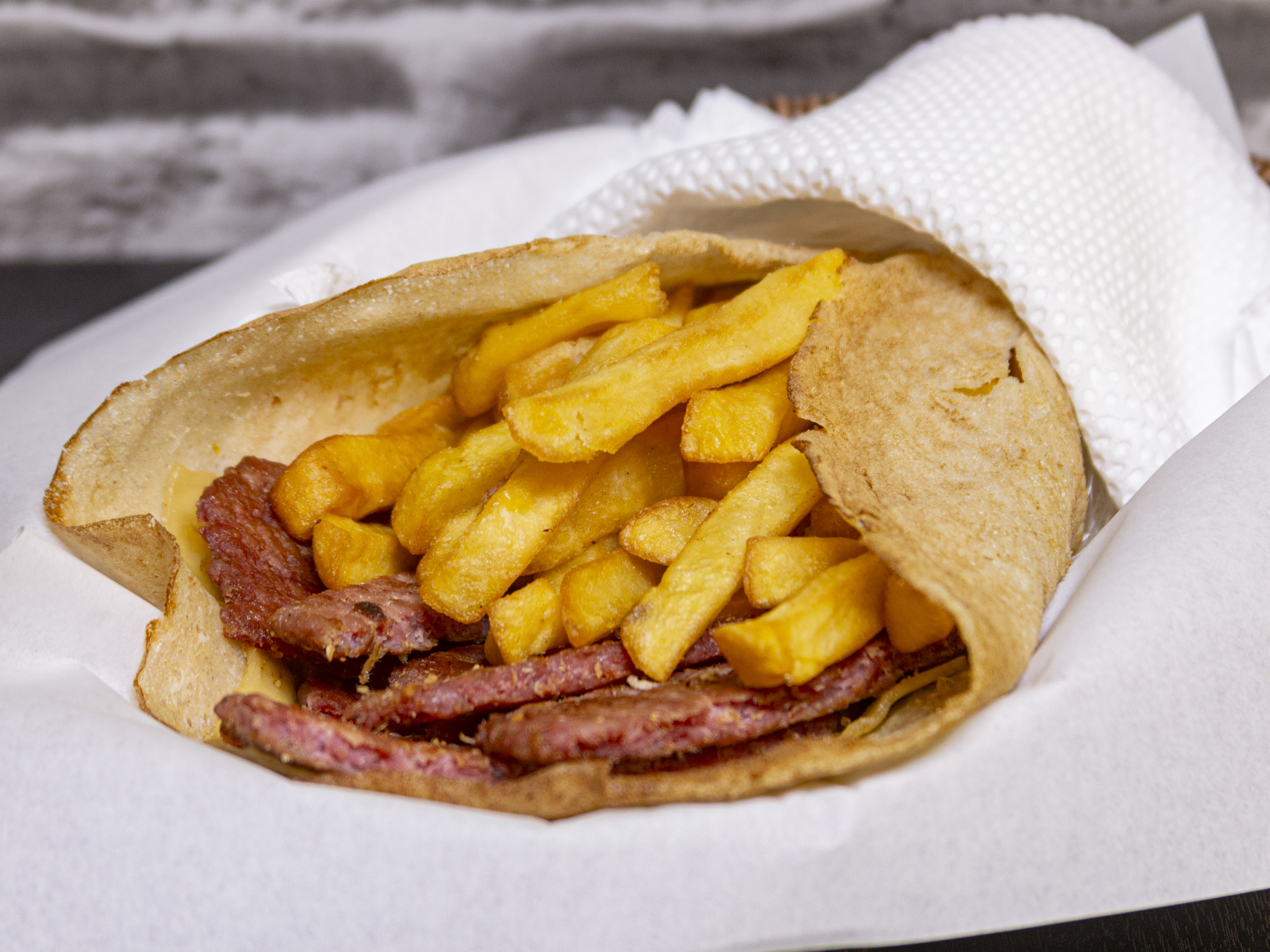 tortilla artesanal,2 quesos ,porcion de chorizo,papas fritas o al hilo y cremas a elegir