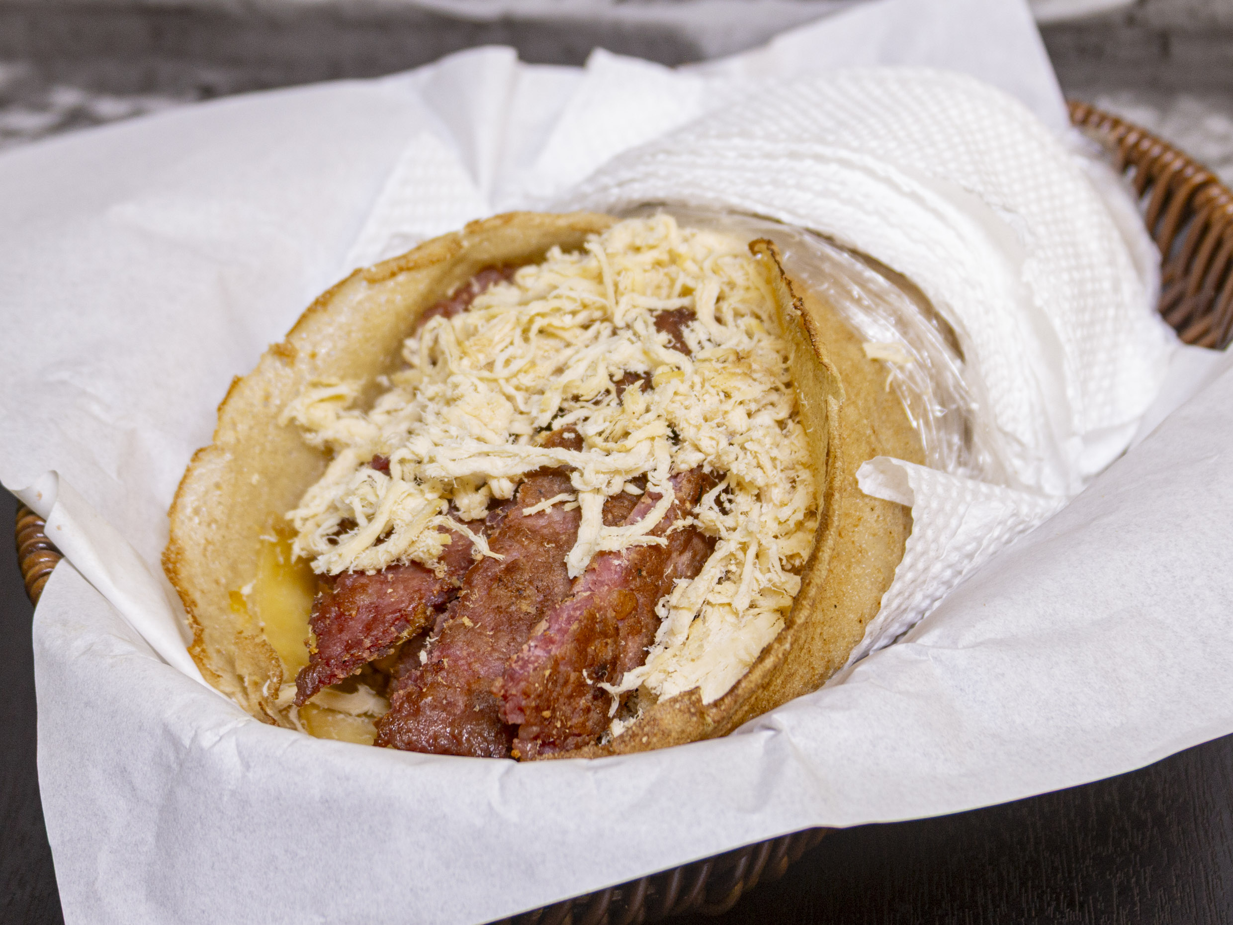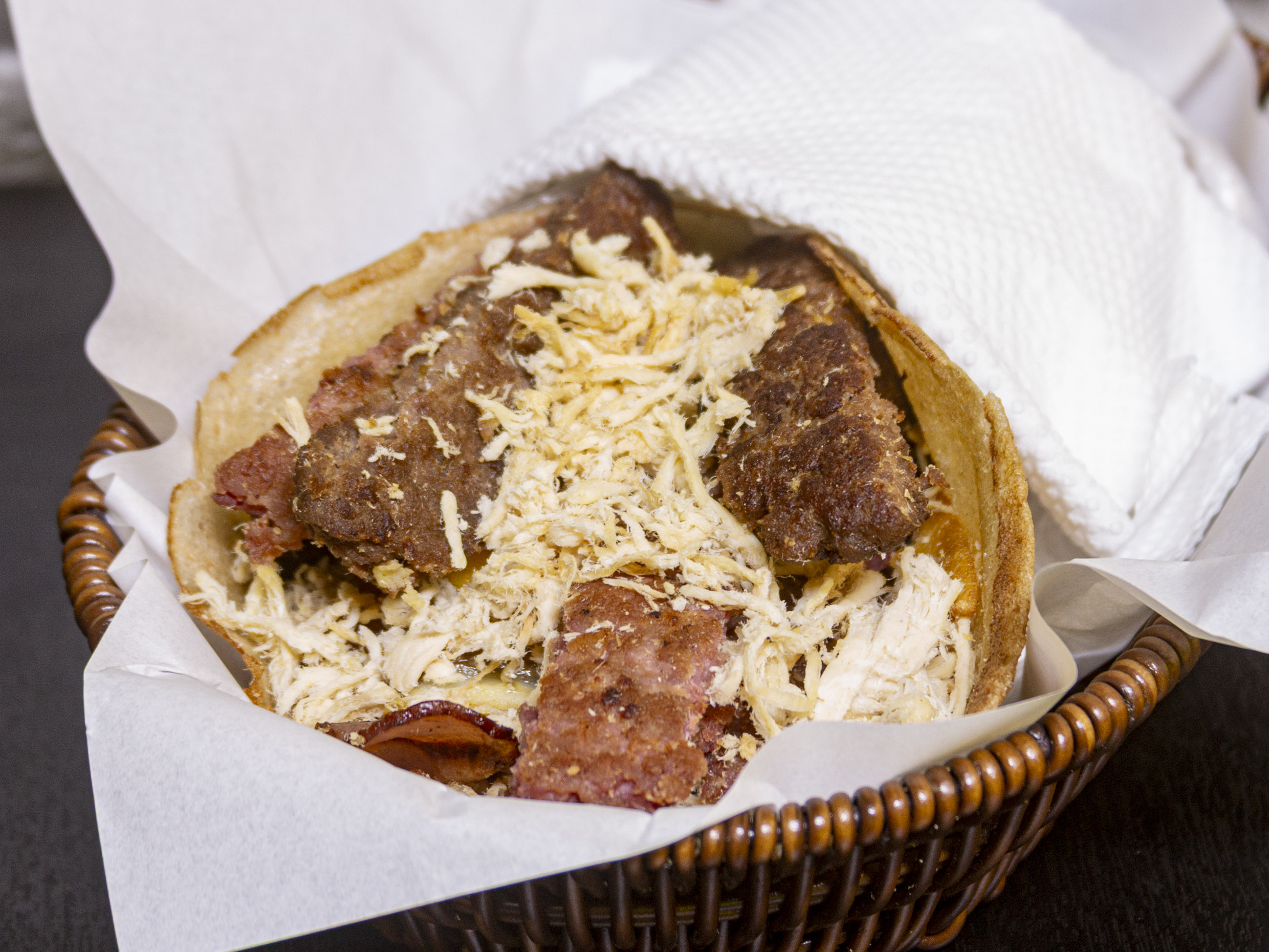 Tacos con pollo, chorizo, queso y tocino.