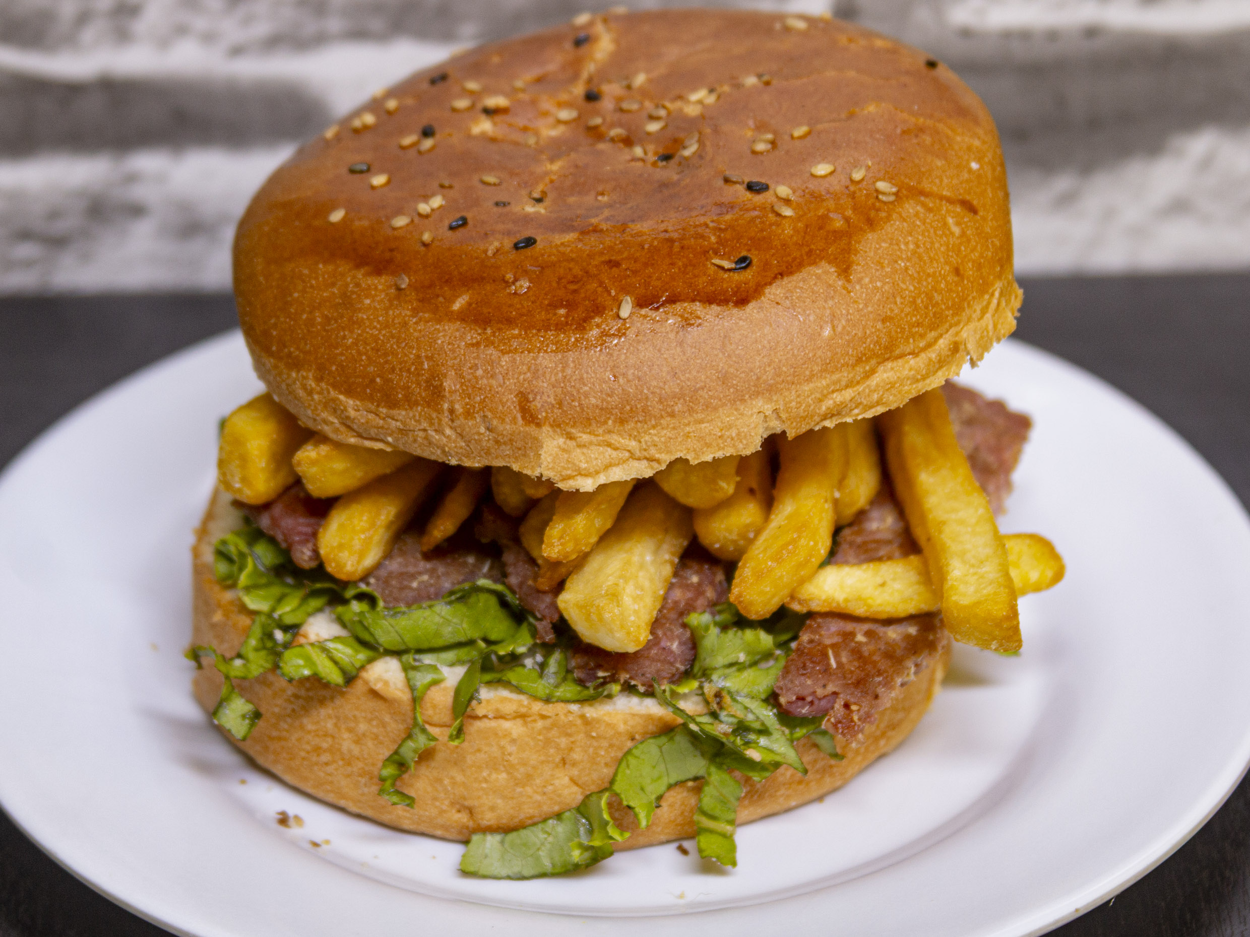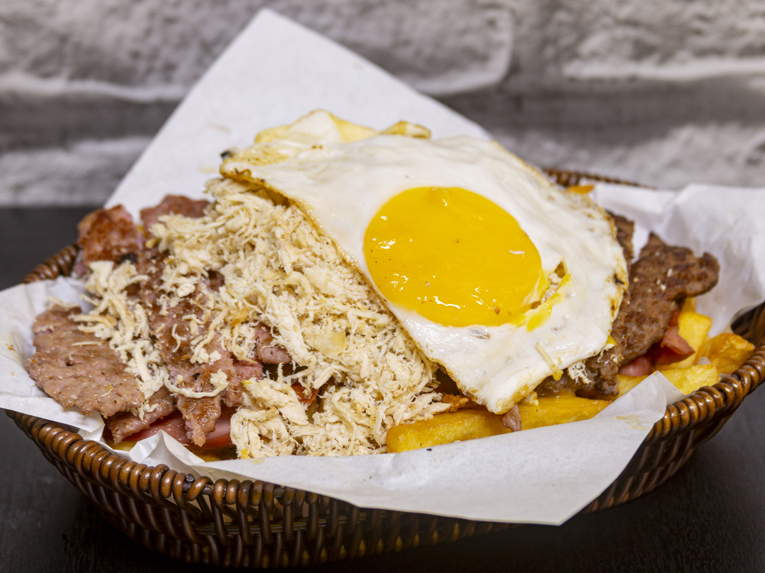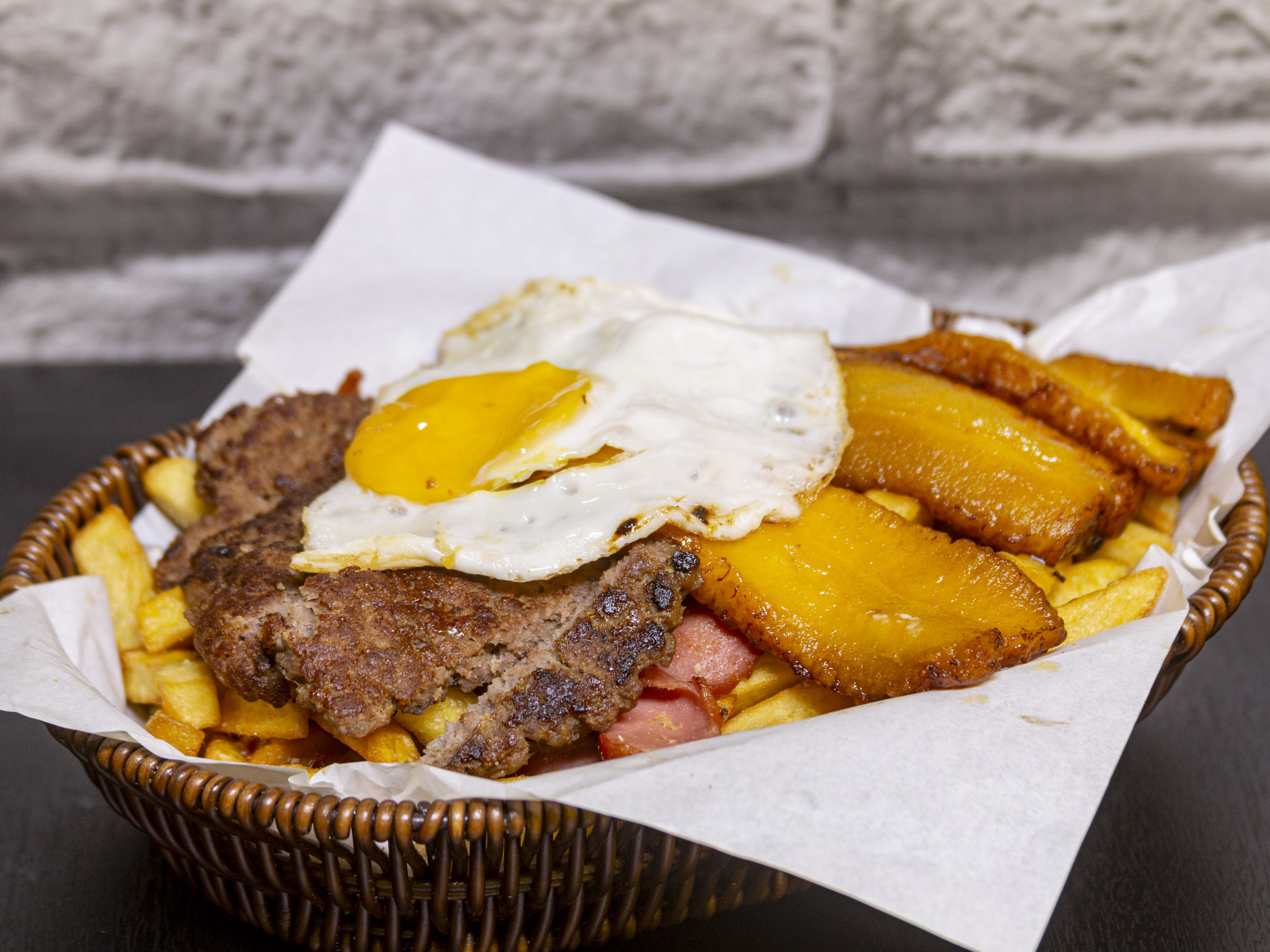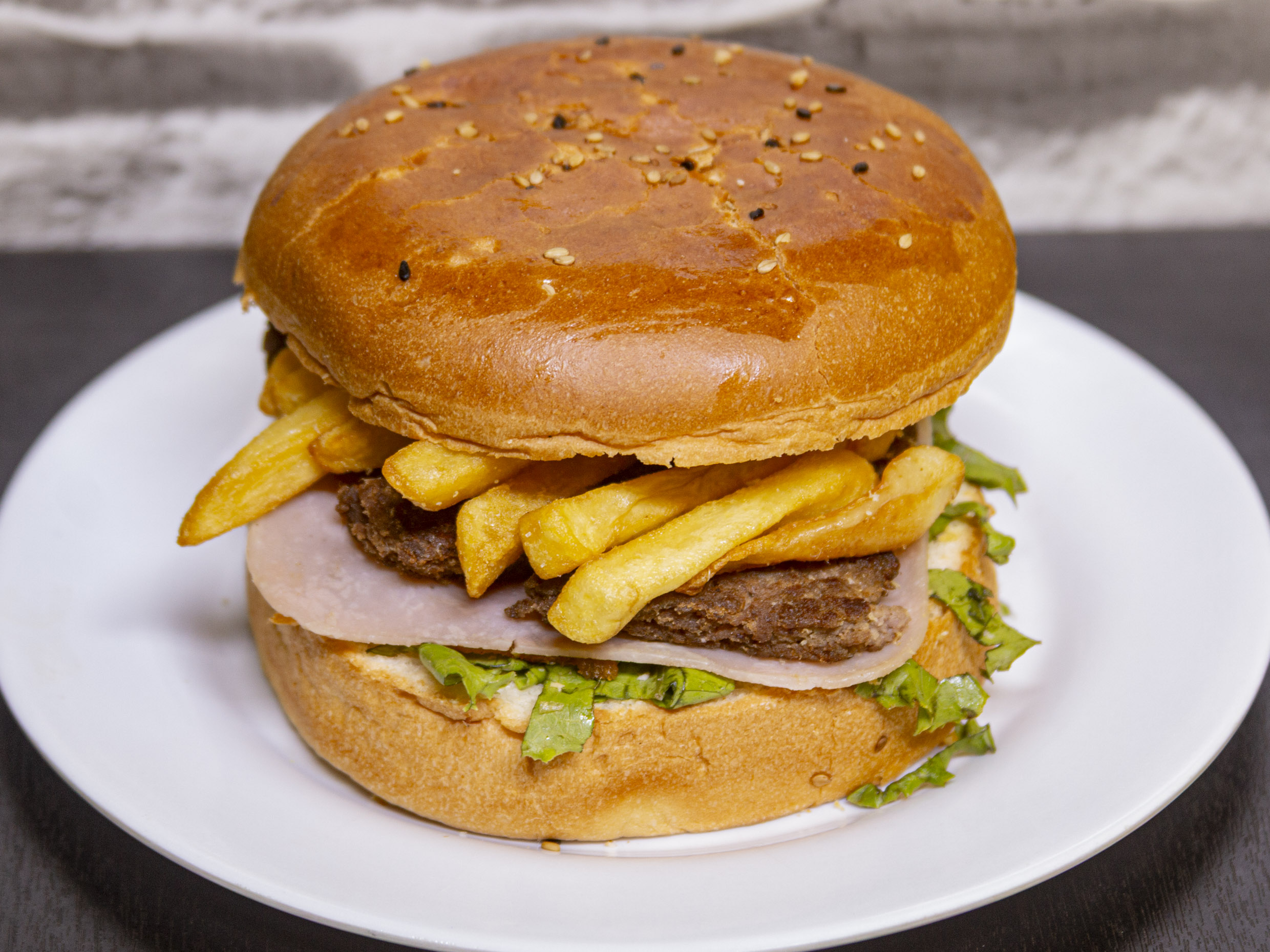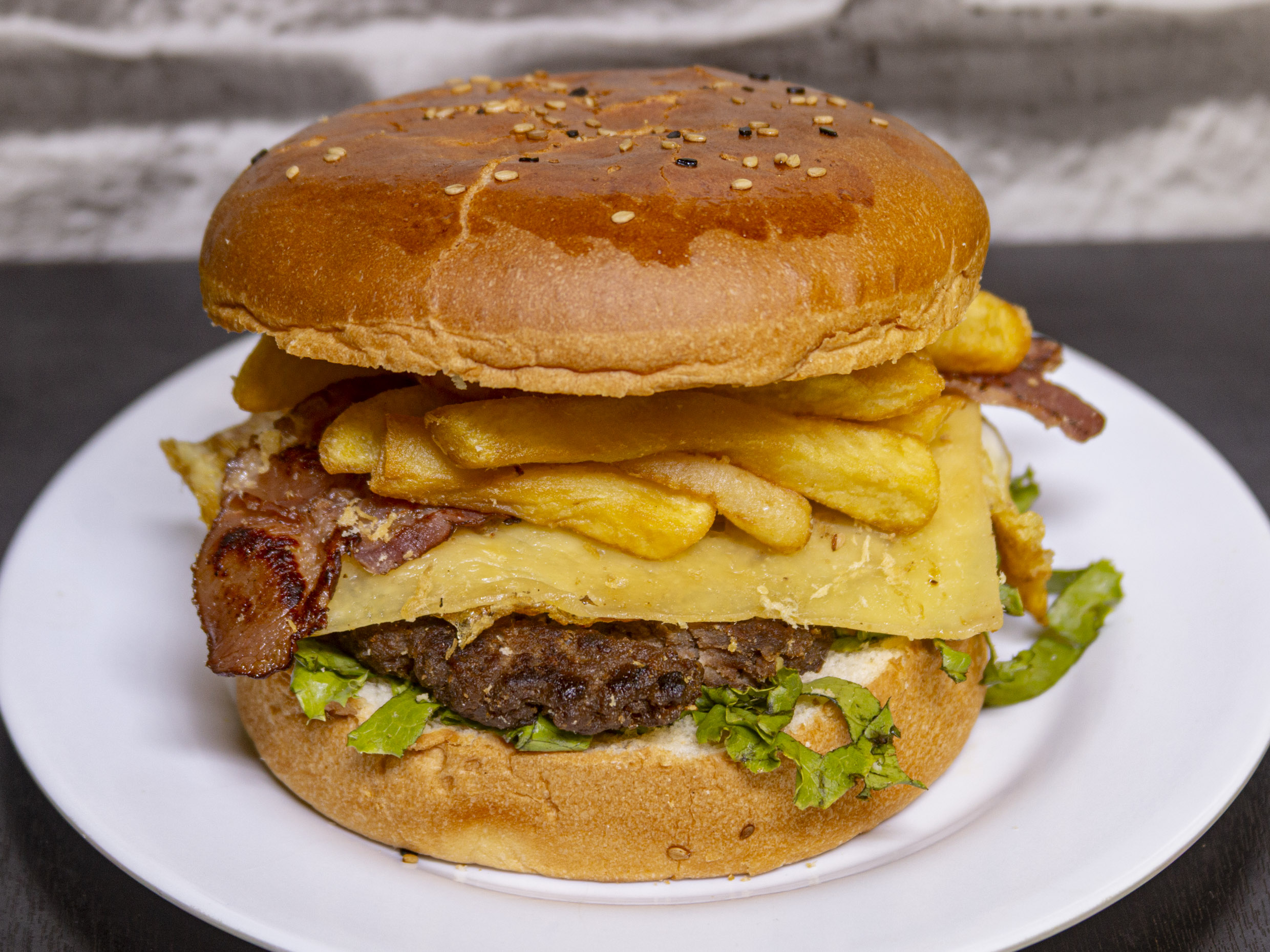 Hamburguesa con carne, pollo, chorizo, queso, huevo y tocino.