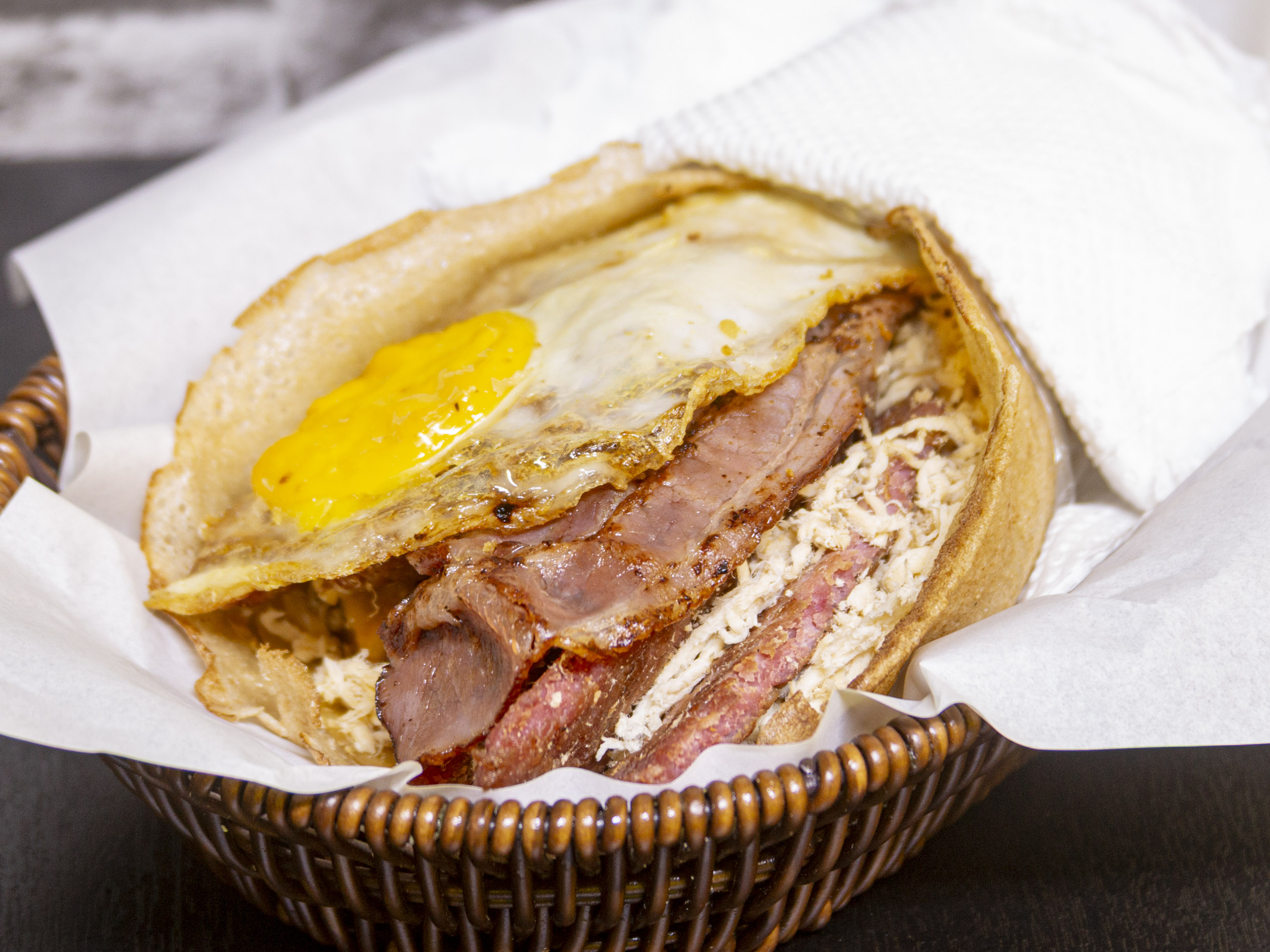 Tacos con pollo, chorizo, queso, tocino y huevo.