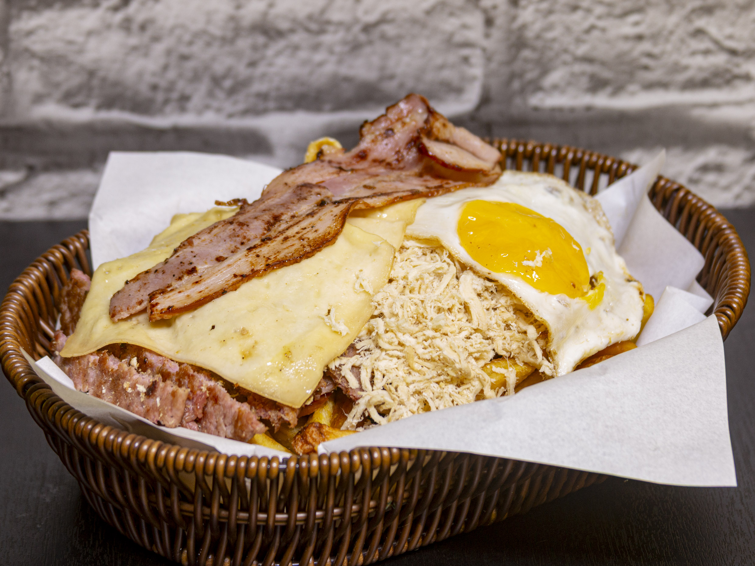 Hot-dog con chorizo, hamburguesa, huevo, pollo, tocino y queso.