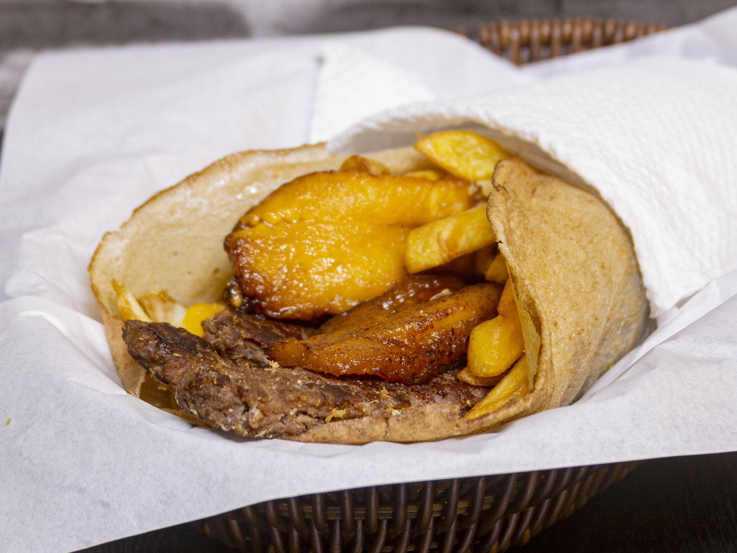 Tacos con carne o pollo, huevo y plátano.