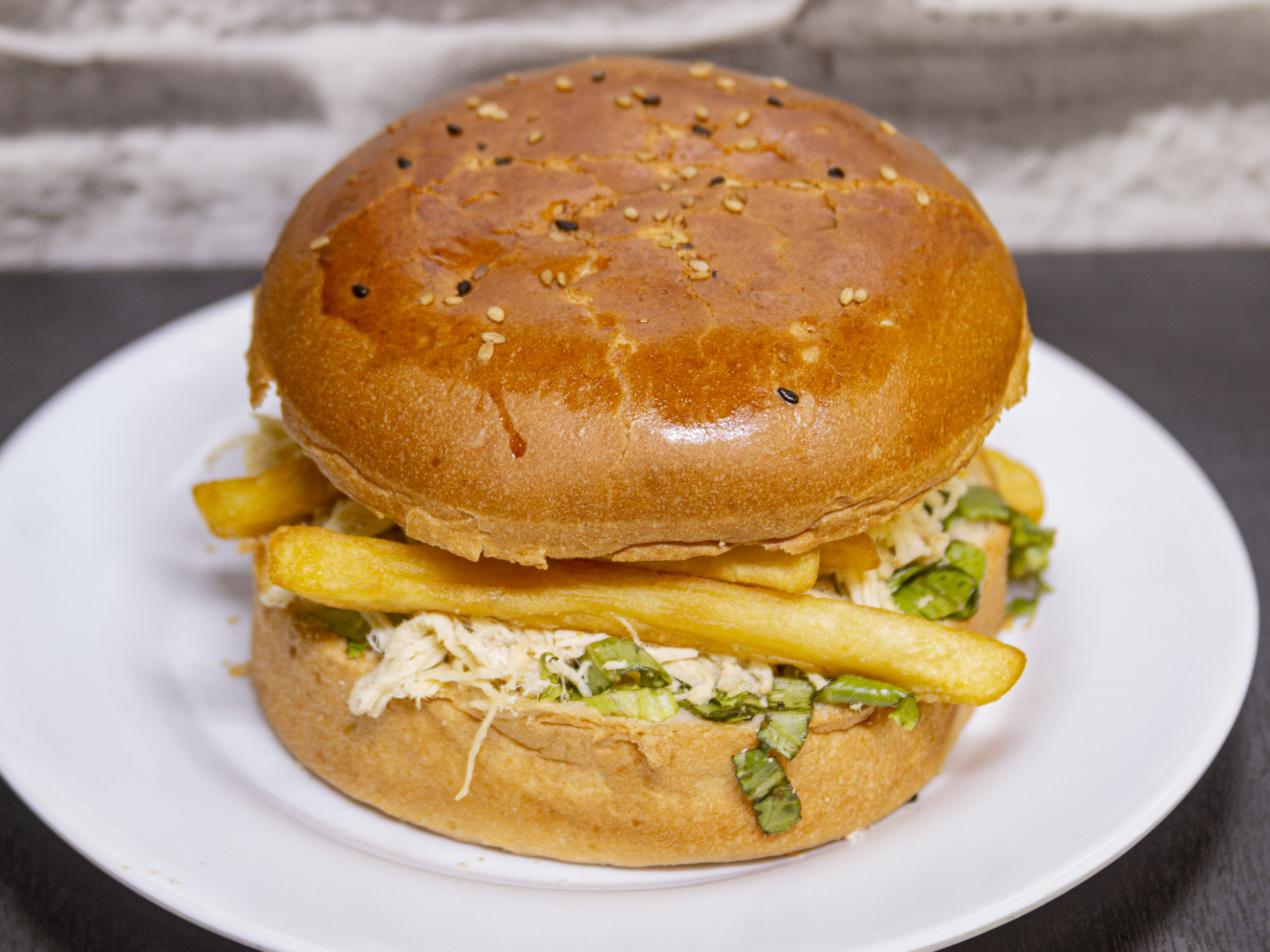 Sándwich de pollo deshilachado.