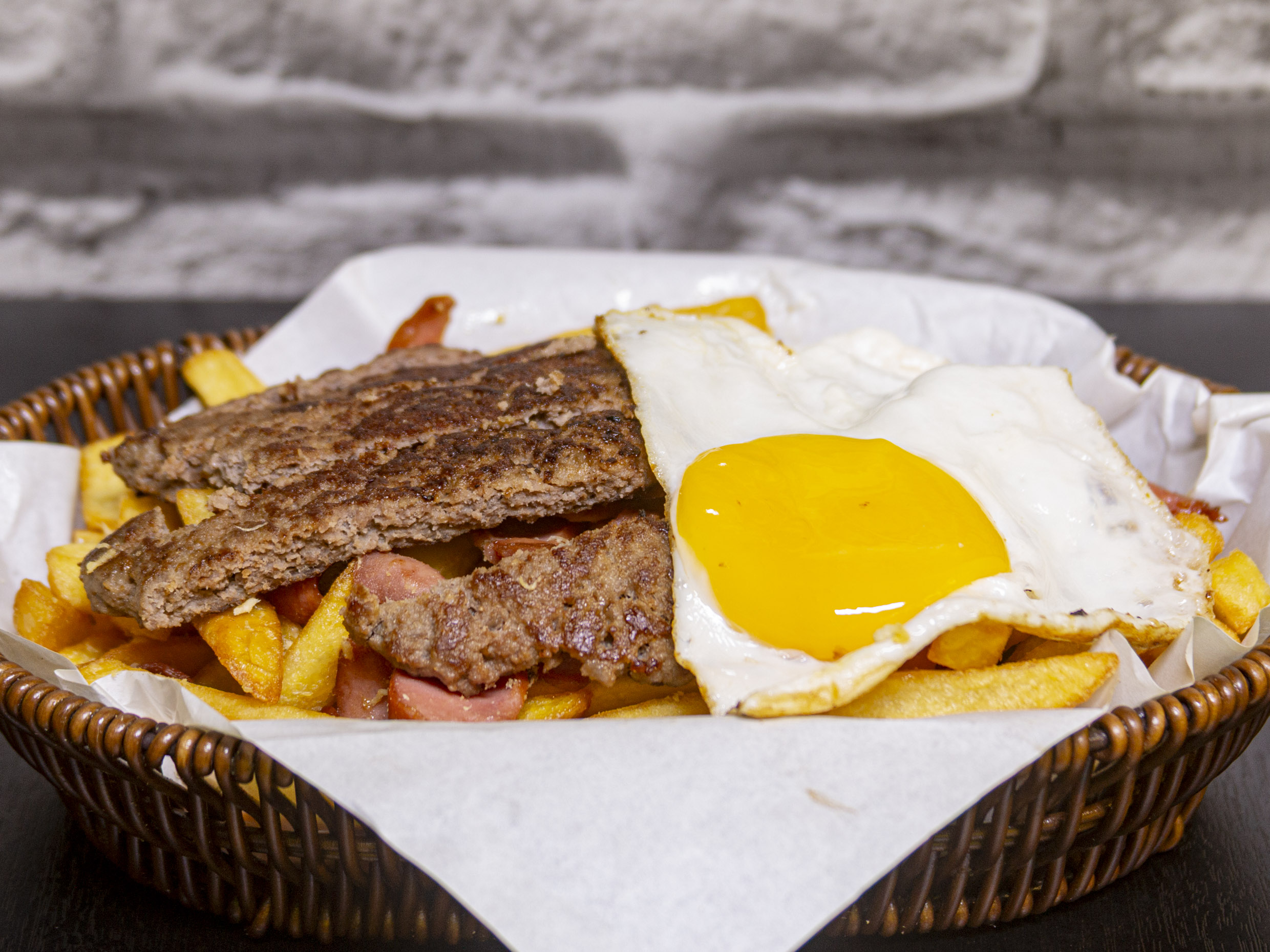 Hot-dog con chorizo, hamburguesa, huevo y papas fritas.