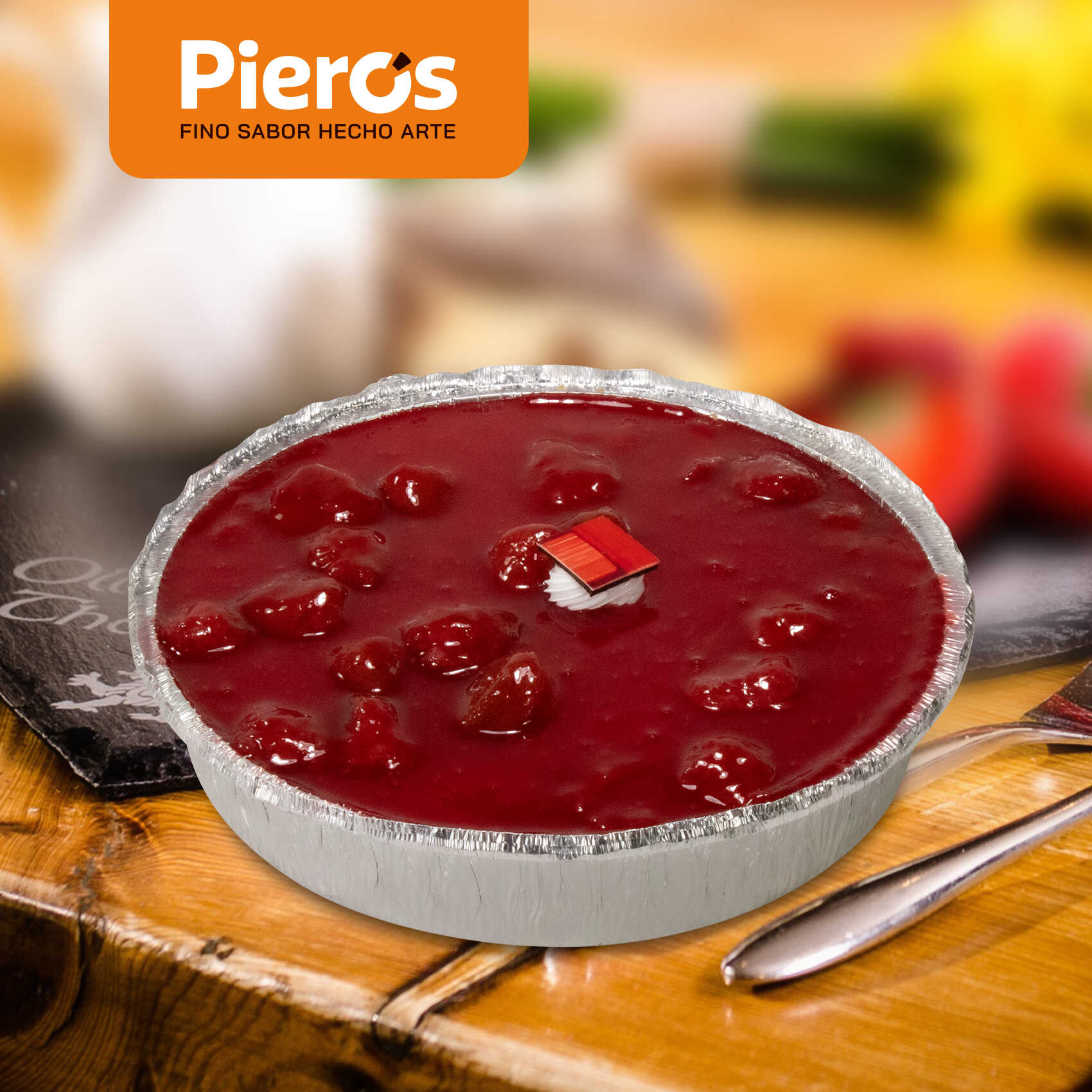 Galletas de vainilla molidas, cubiertas con una riquísima mezcla de queso crema, decorado con jalea de fresa y filigranas de chocolate.