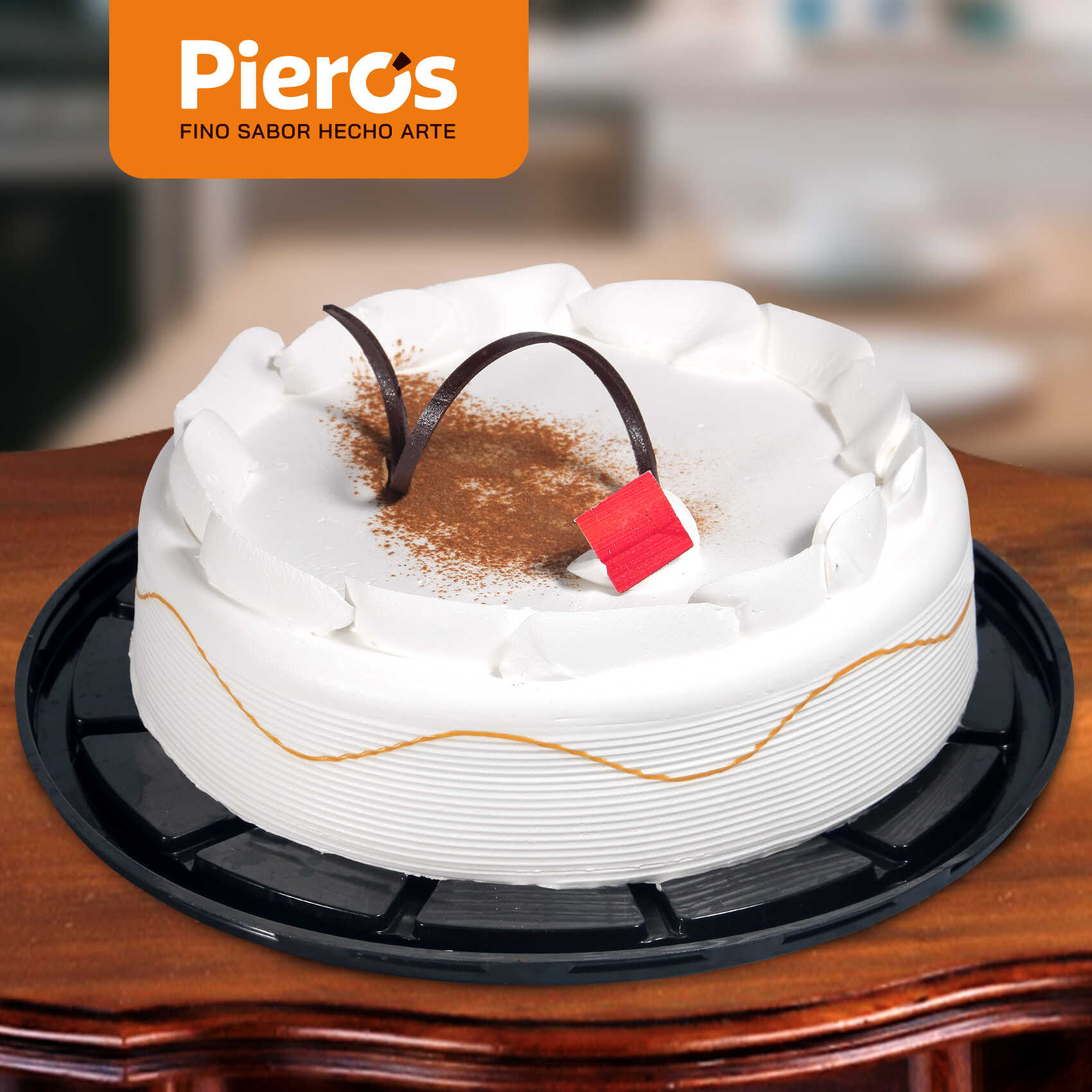 Bizcochuelo de vainilla, bañado con nuestra receta de 4 leches sabor café, relleno de crema de café, cubierto con chantilly sabor a café y decorado con filigrana de chocolate.