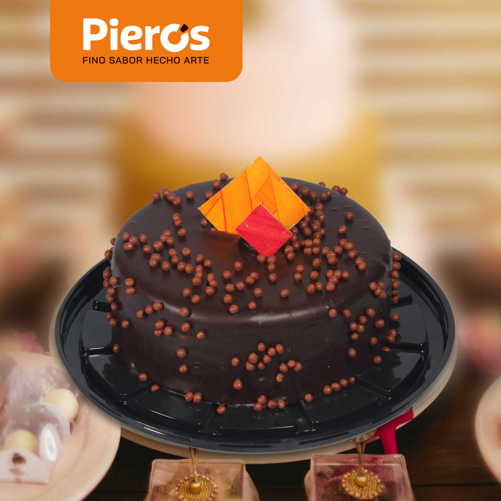 Queque de chocolate relleno con crema de lúcuma, decorado con ganache y Picaras.