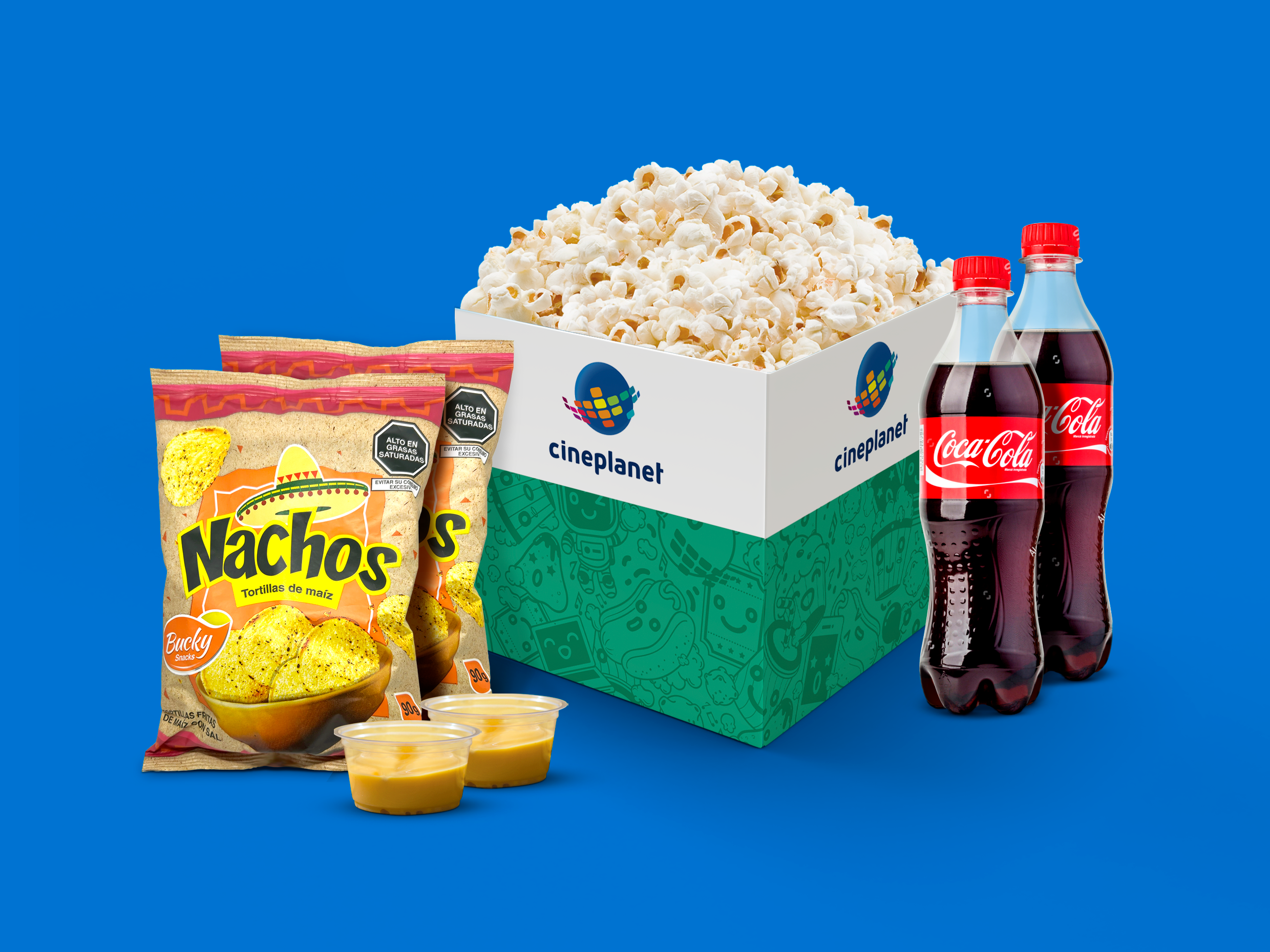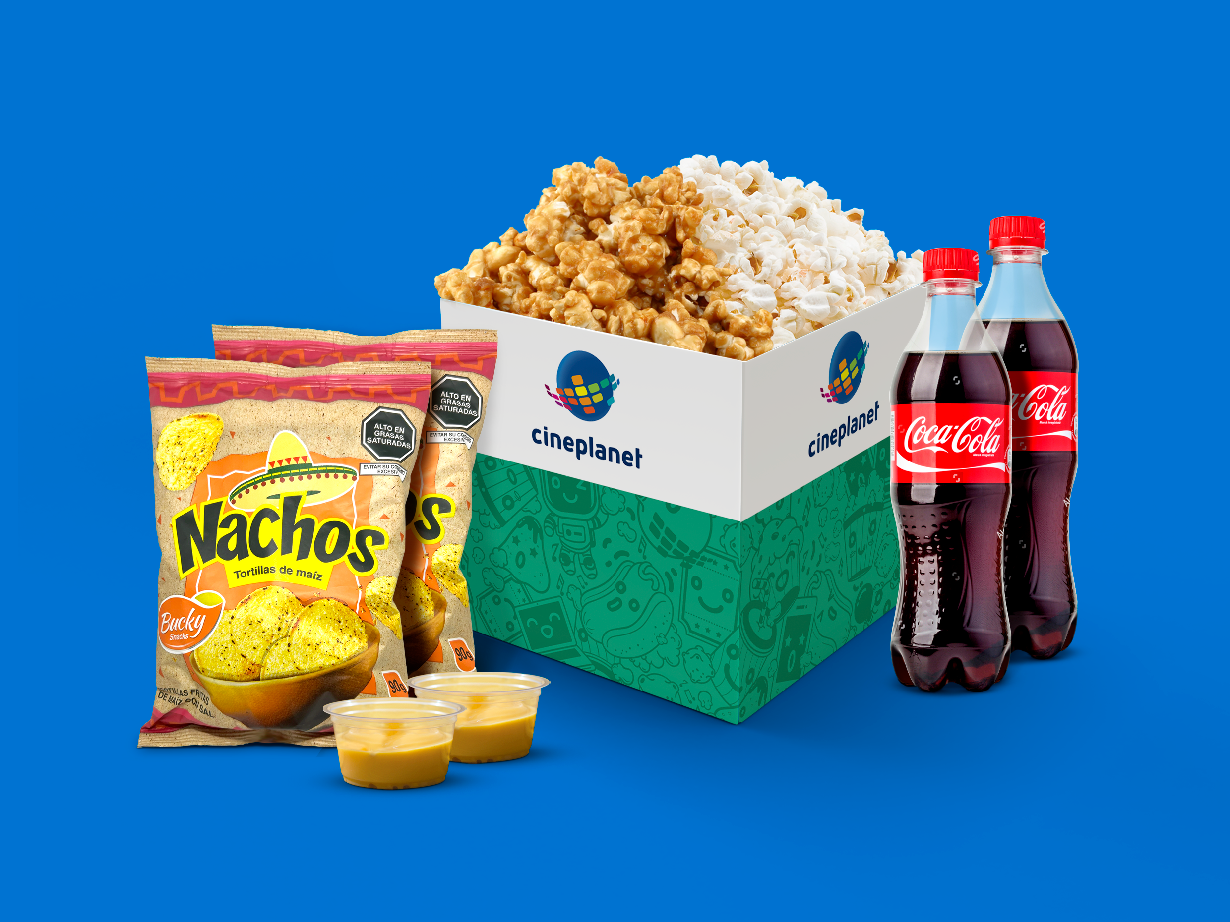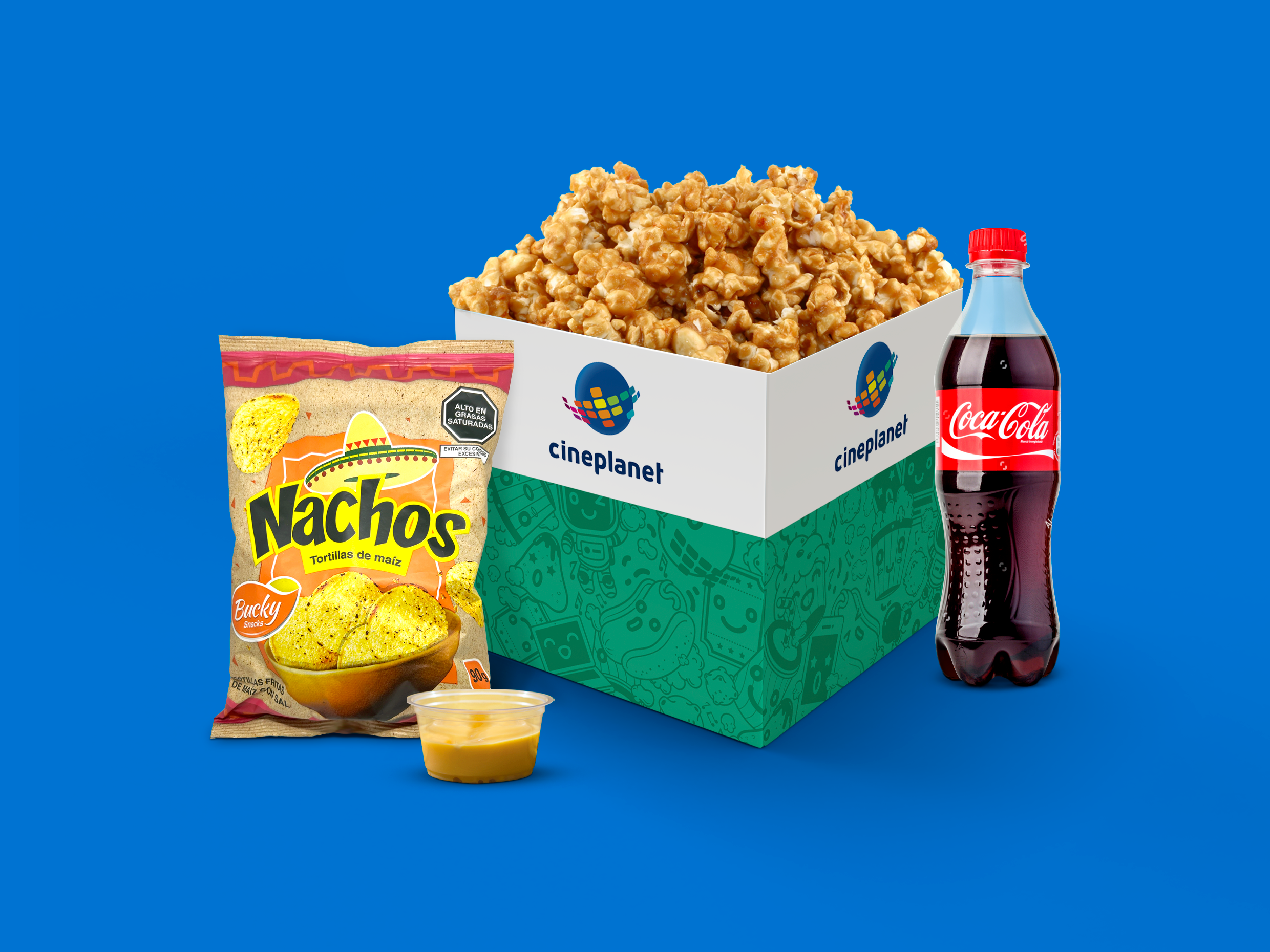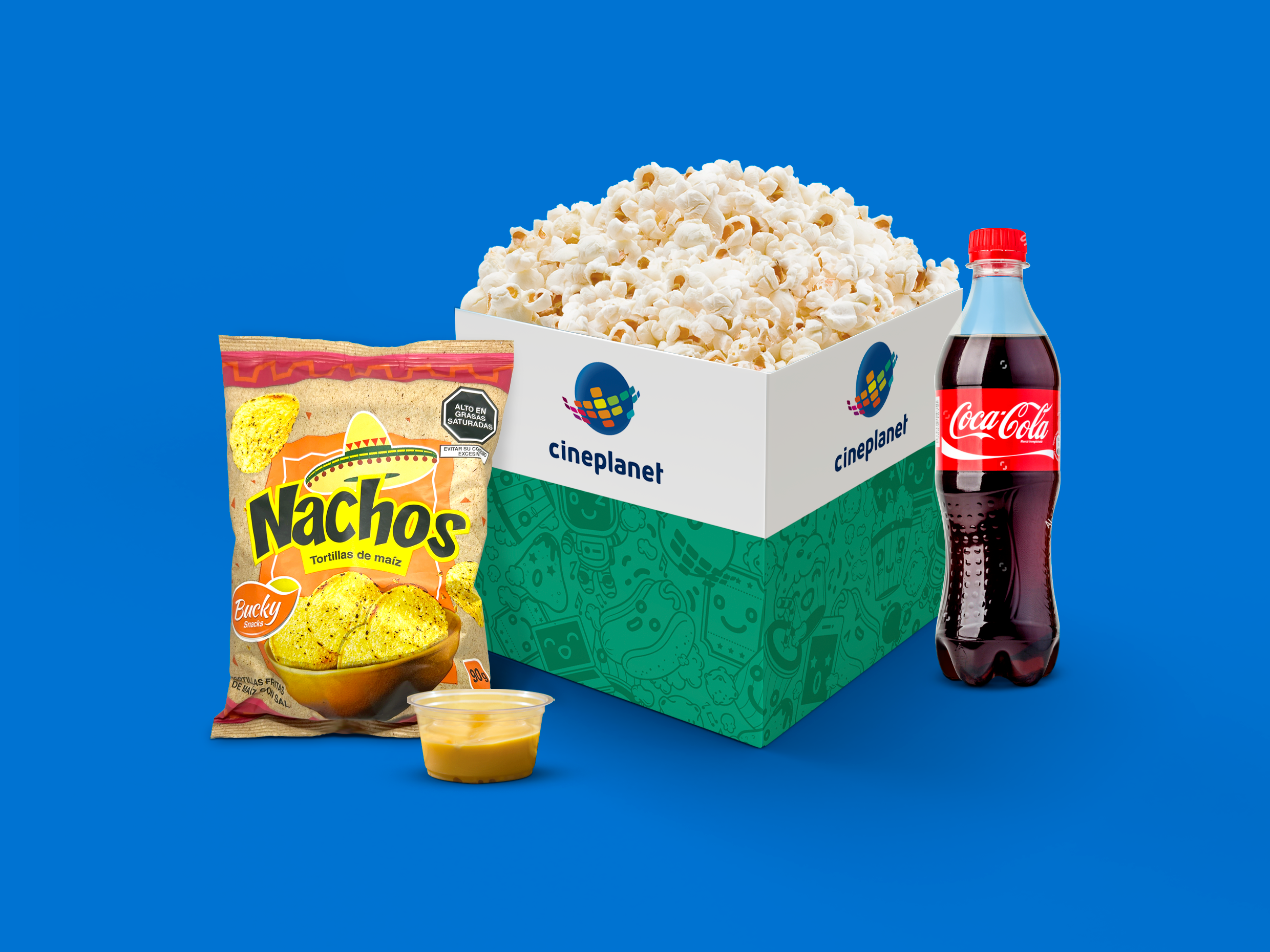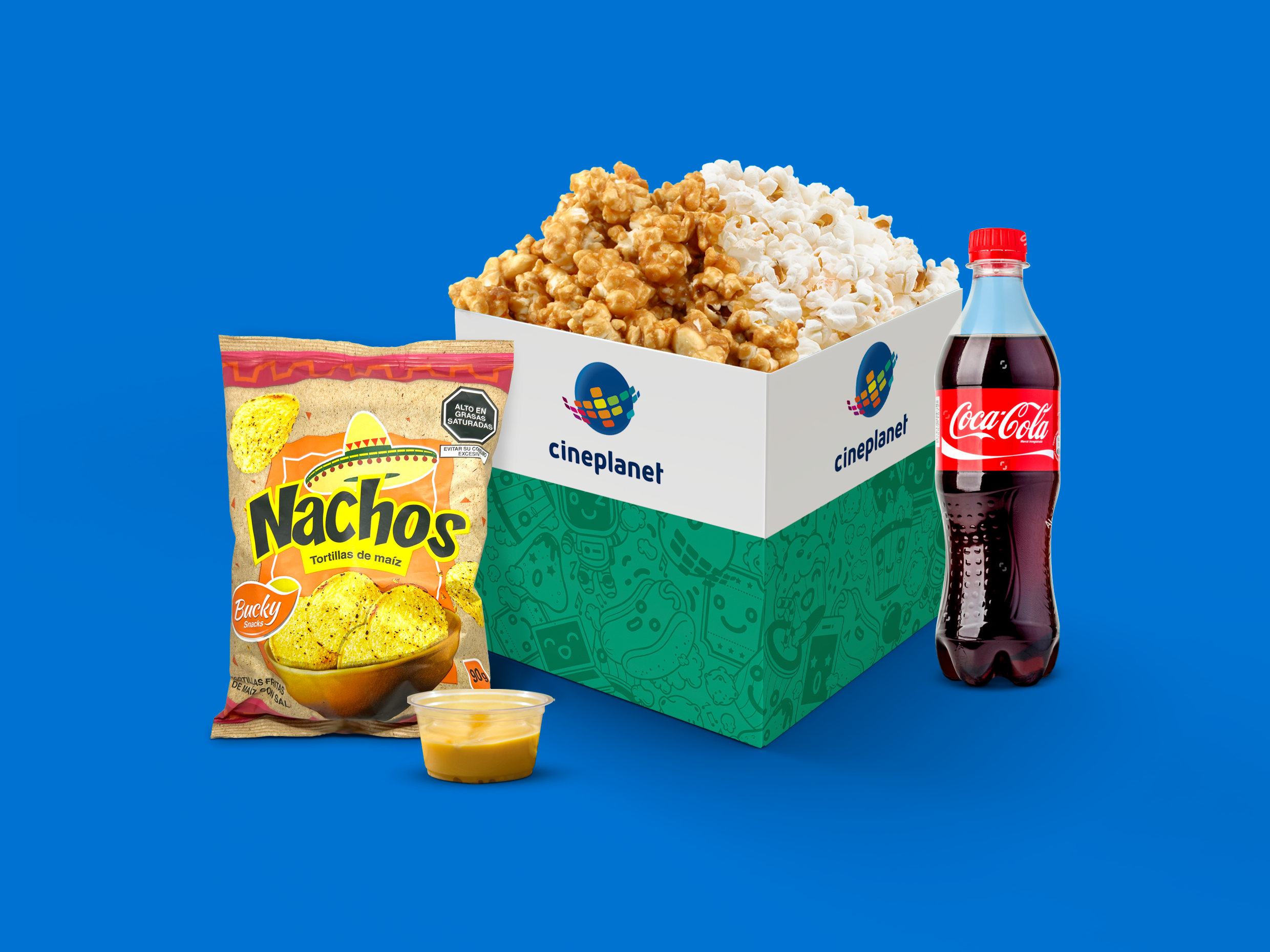1 Caja de canchita grande dulce + 1 gaseosa en botella + nachos con queso cheddar.