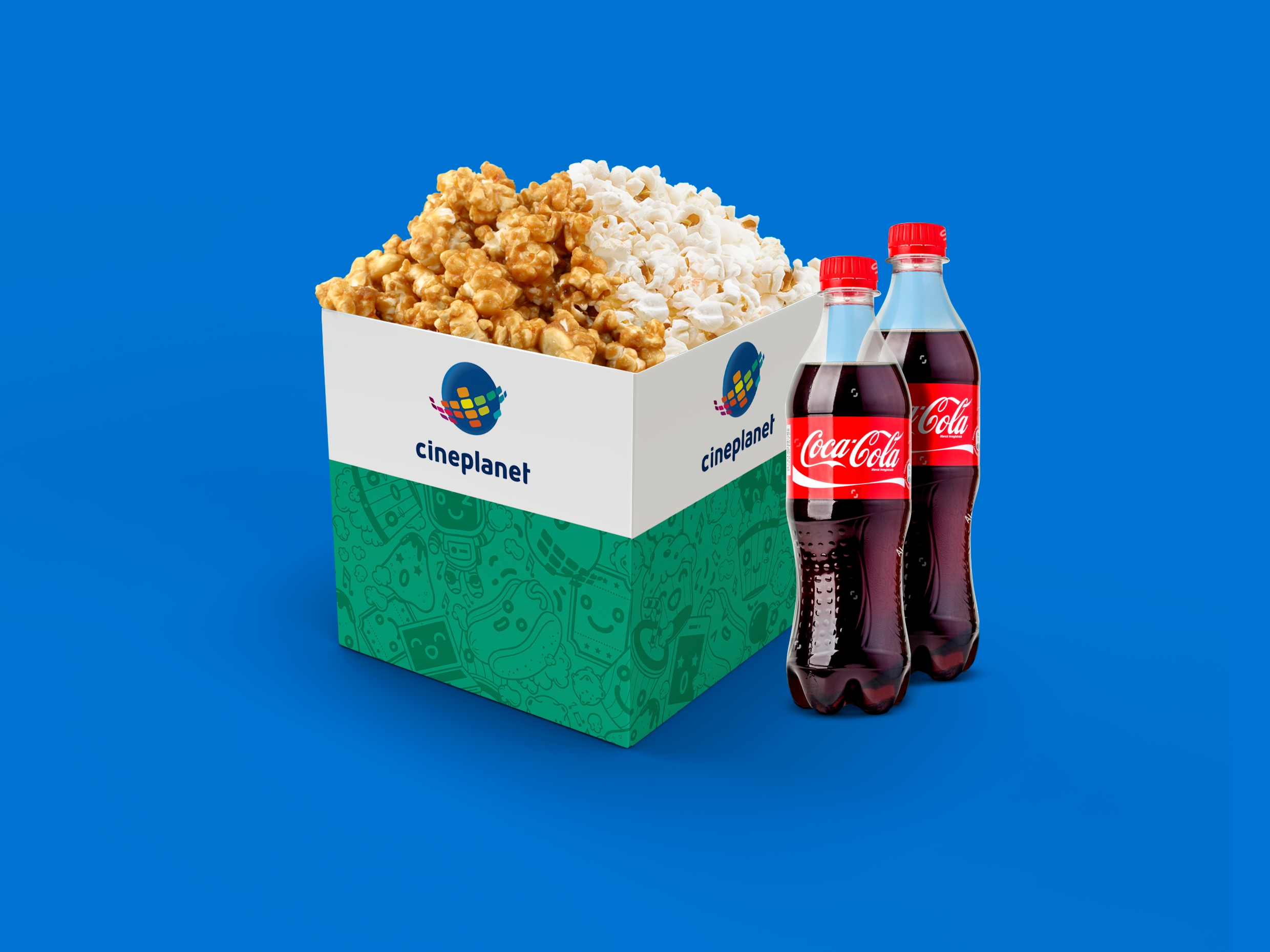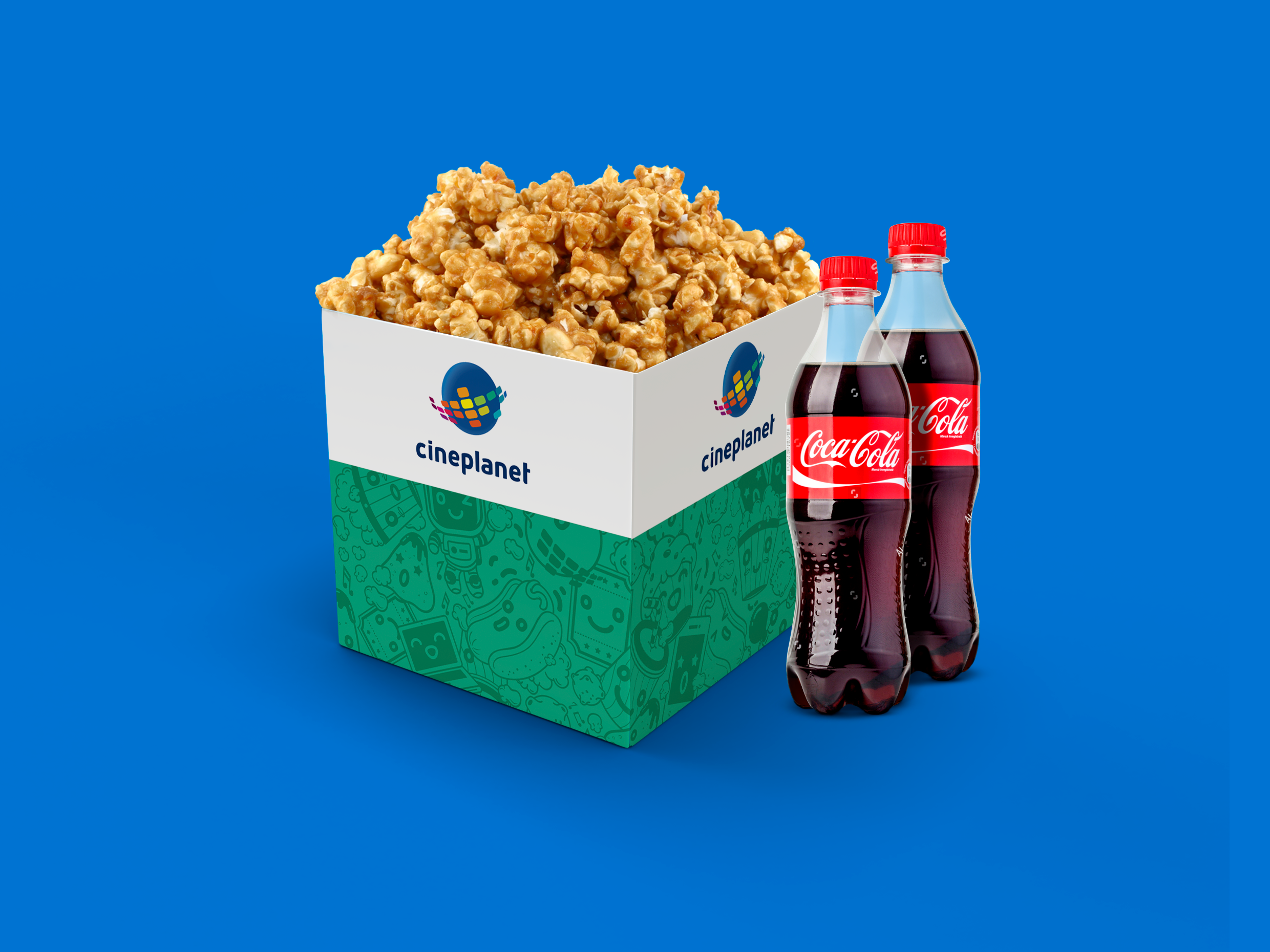 1 Caja de canchita grande dulce + 2 gaseosas en botella.
