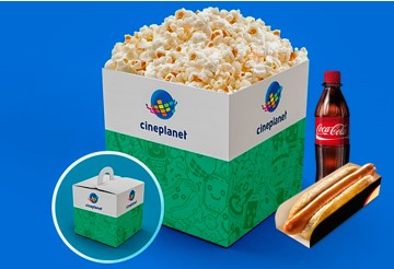 1 Caja de canchita grande salada + 1 gaseosa en botella + 1 hot dog.