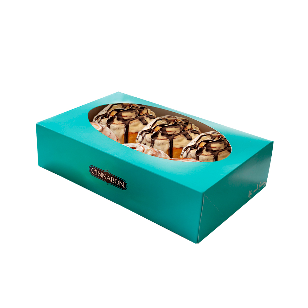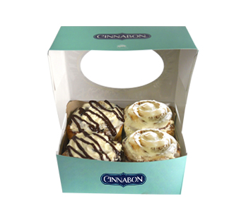 Rollos de canela medianos llamados minibon con frosting (2 unidades) más rollos rellenos de chocolate, cubiertos con frosting y chocolate (2 unidades).
