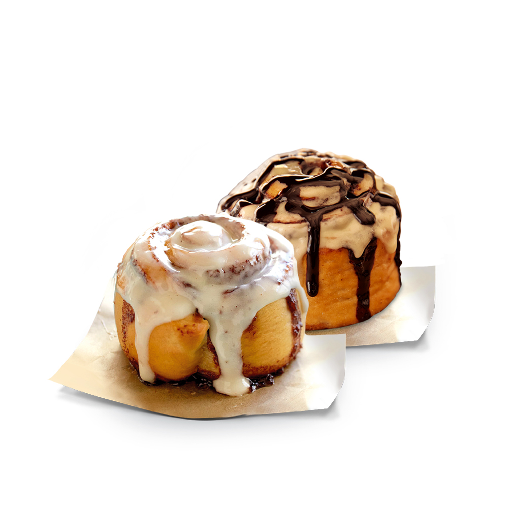 Rollo de canela clásico cubierto con frosting (unidad) más rollo relleno de chocolate y frosting (unidad).