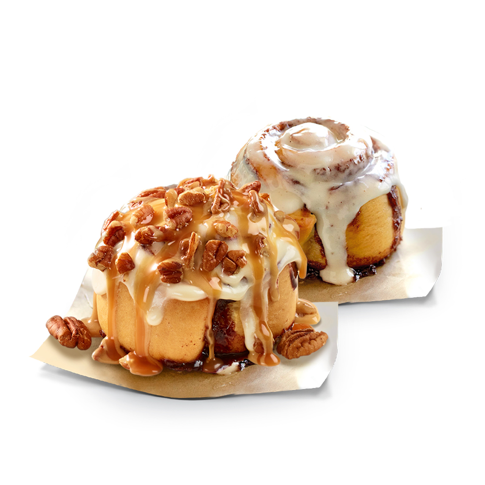 Rollo de canela clásico cubierto con glaseado frosting (unidad) más rollo de canela clásico con frosting, caramelo y pecanas.