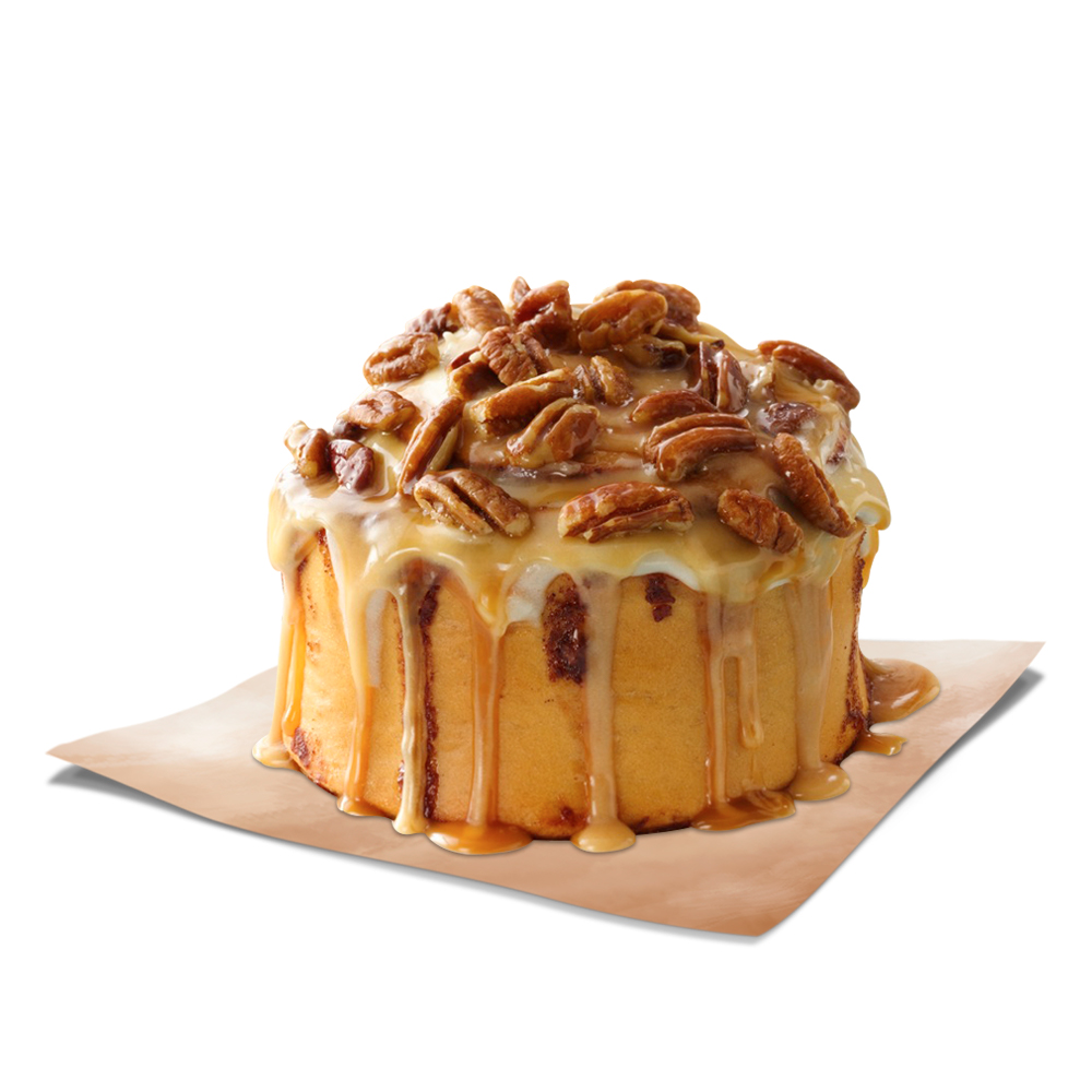 Rollo de canela clásico cubierto con frosting, caramelo y pecanas.