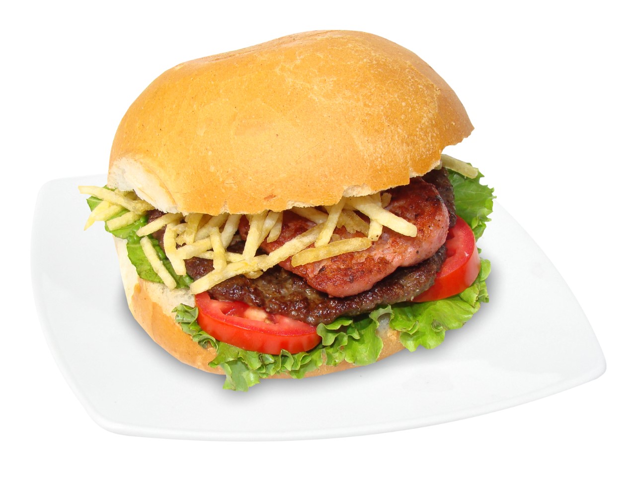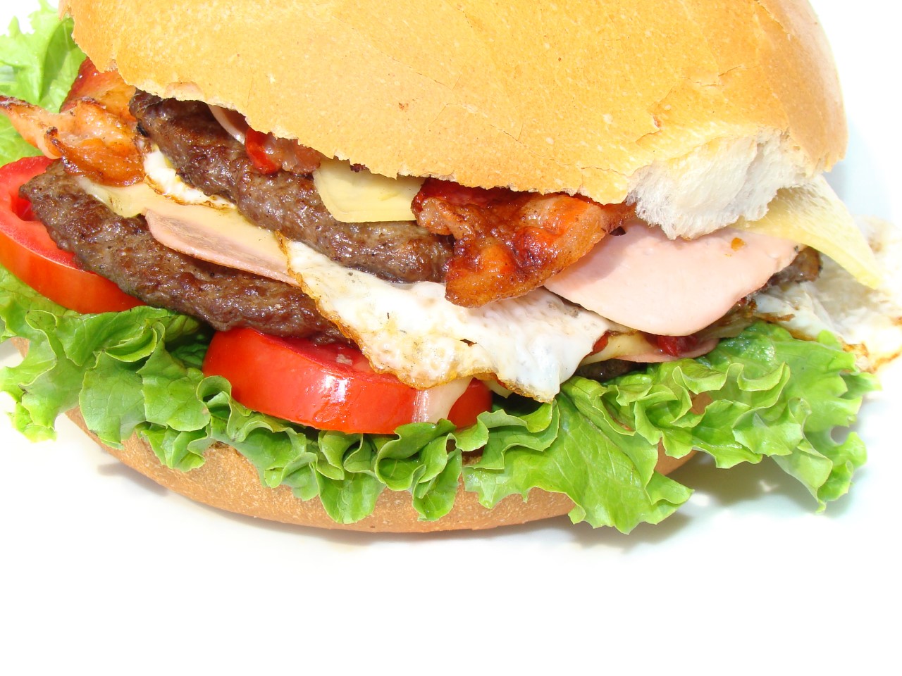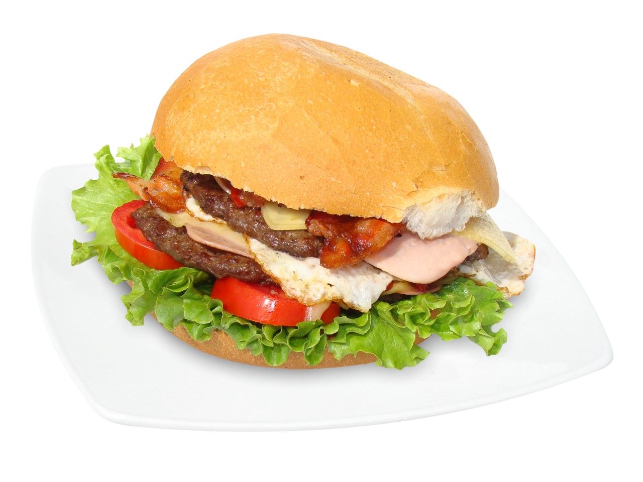 Hamburguesa, jamón, queso, tocino y huevo.
