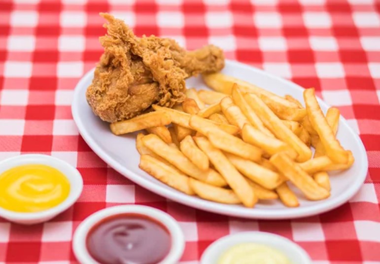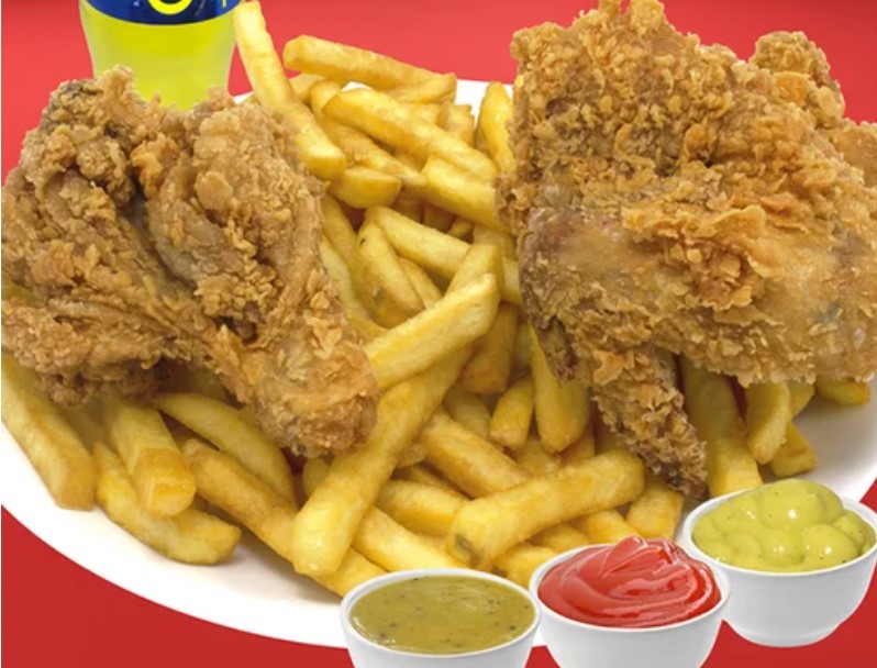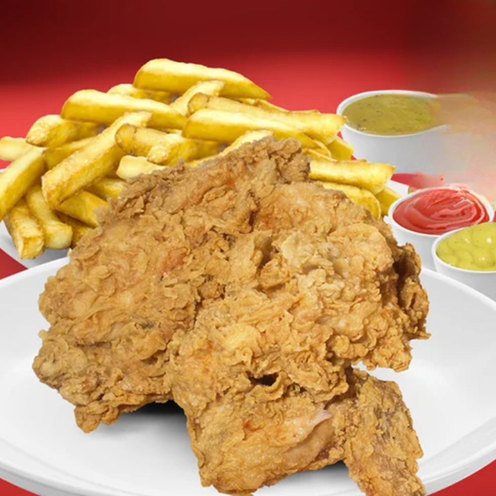 Pierna broaster crujiente con papas fritas, vegetales de temporada y 2 salsas a elegir.