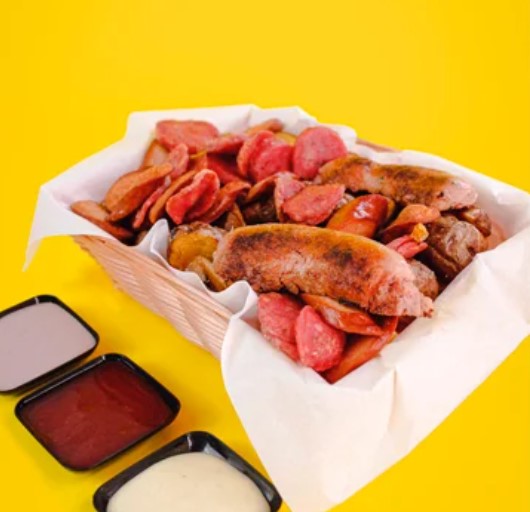 Trozos de filete pollo con salchicha de hot dog, papas fritas, vegetales de tomate y lechuga más 2 salsas a elegir.