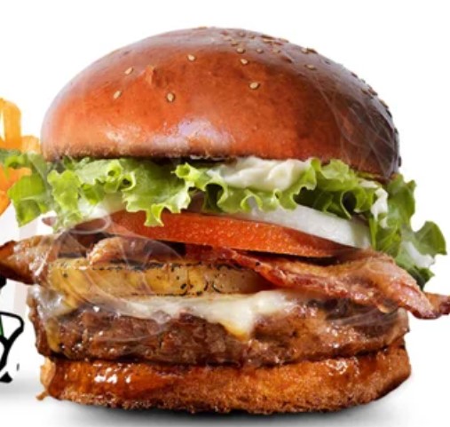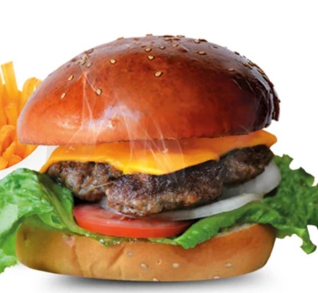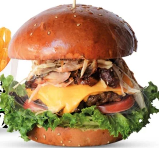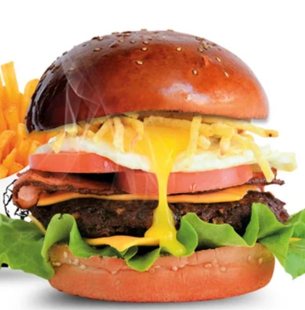 Hamburguesa de carne, 3 tipos de queso: dambo, cheddar y edam, tocino, papas fritas, vegetales de tomate y lechuga más 2 salsas a elegir.
