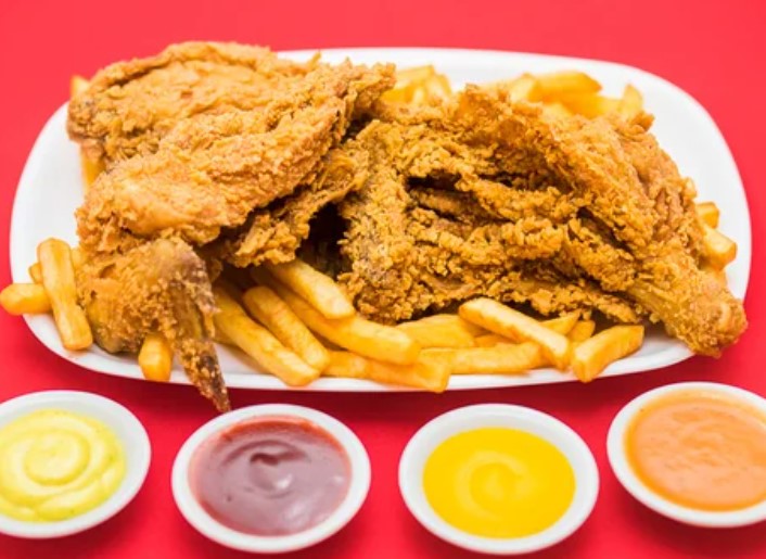Pecho broaster crujiente de medio kilo con papas fritas, vegetales de temporada y 4 salsas a elegir.