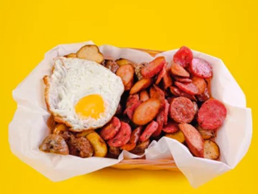 Papas fritas con chorizo, huevo, salchichas frankfuter & vegetales.