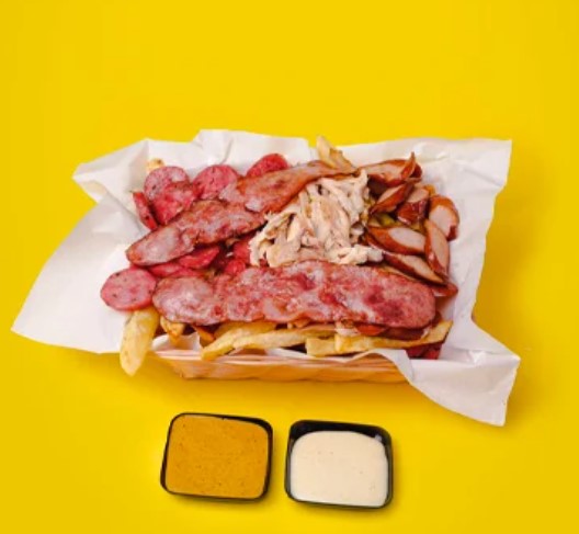 Papas fritas con huevo, queso, jamón, salchichas de hot dog, vegetales de temporada y 2 salsas a elegir.