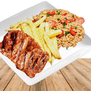 Mostrito parrillero, porción de chaufa, papas fritas y chuleta criolla.
