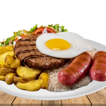 Menú Taipa, arroz, huevo frito, papas fritas, ensalada y chorizo.