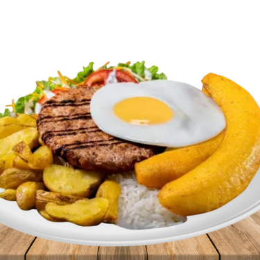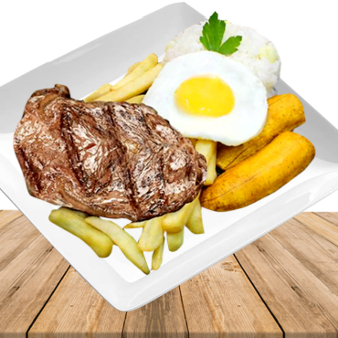 Carne a lo pobre, huevo frito, papas fritas, plátano frito y ensalada.