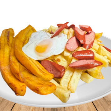Salchiparrilla, papas fritas, hot dog, huevo y chorizo.