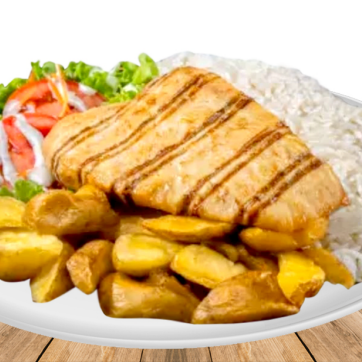 Pechuga a la parrilla, arroz, papas fritas, ensalada y Pepsi 355 ml.