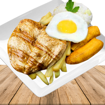 Pechuga a lo pobre, huevo frito, papas fritas, plátano frito y ensalada.