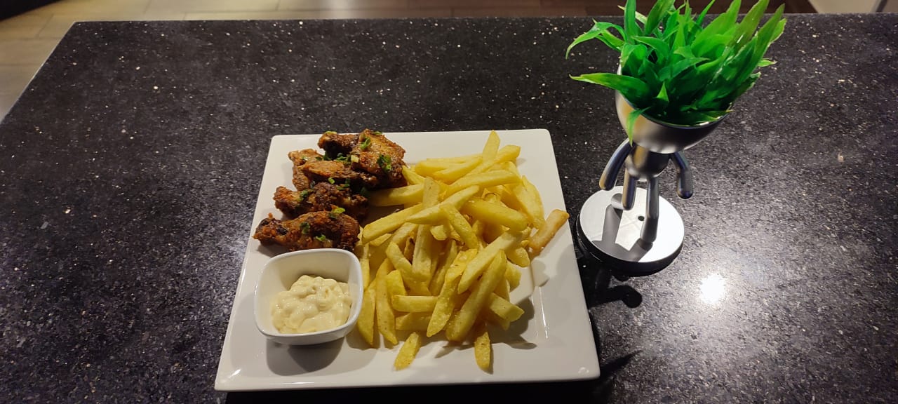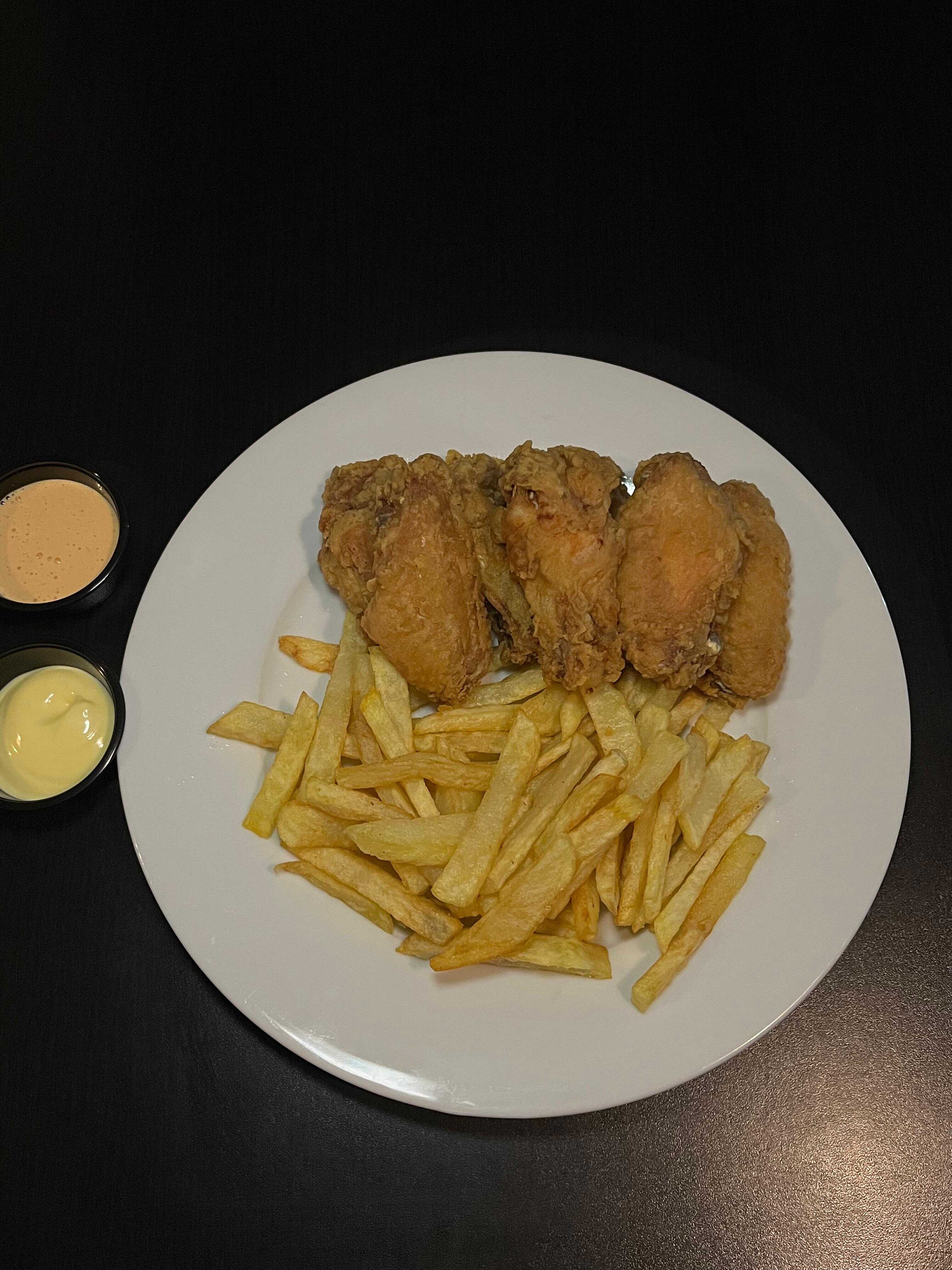 7 Unidades de alitas, 250 g de papas fritas y cremas.