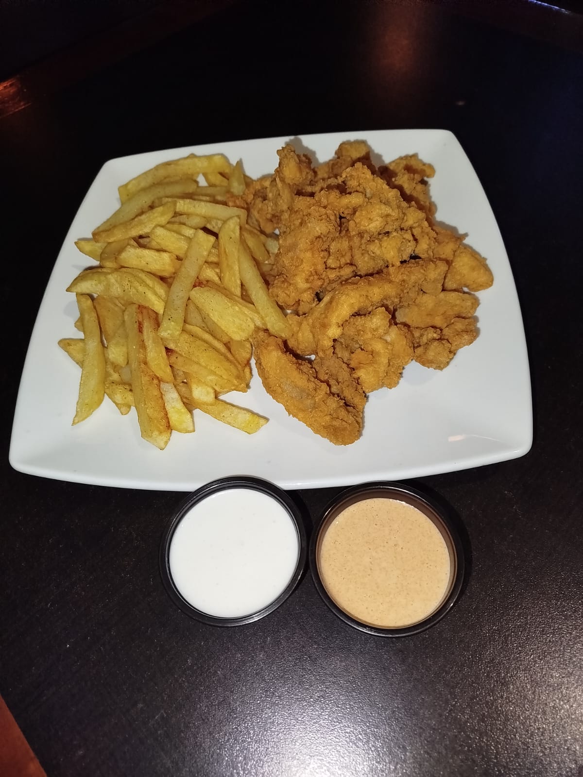 250 g De muslo, 250 g de papas fritas, ensalada y cremas.