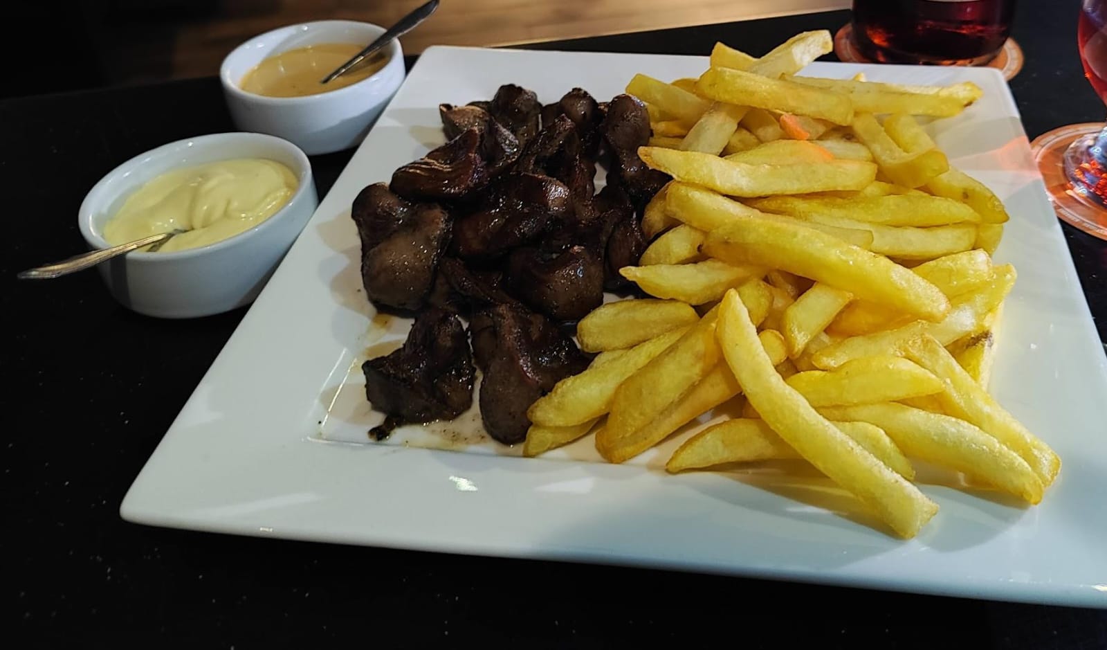 250 g De mollejitas, 250 g de papas fritas, ensalada y cremas.