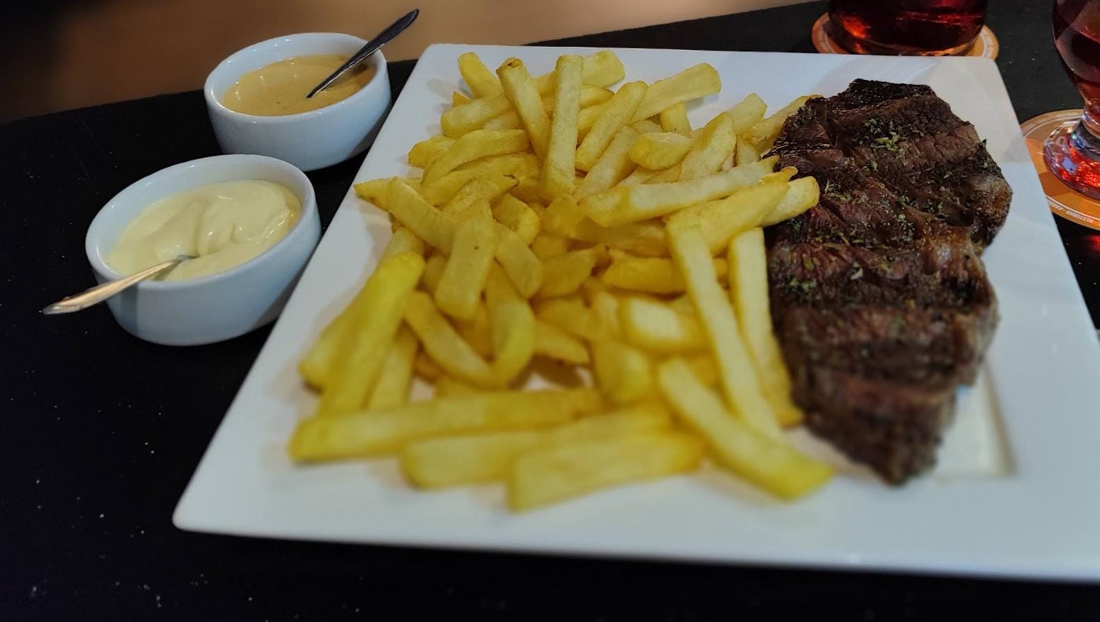 250 g De carne Argentina, 250 g de papas fritas, ensalada y cremas.