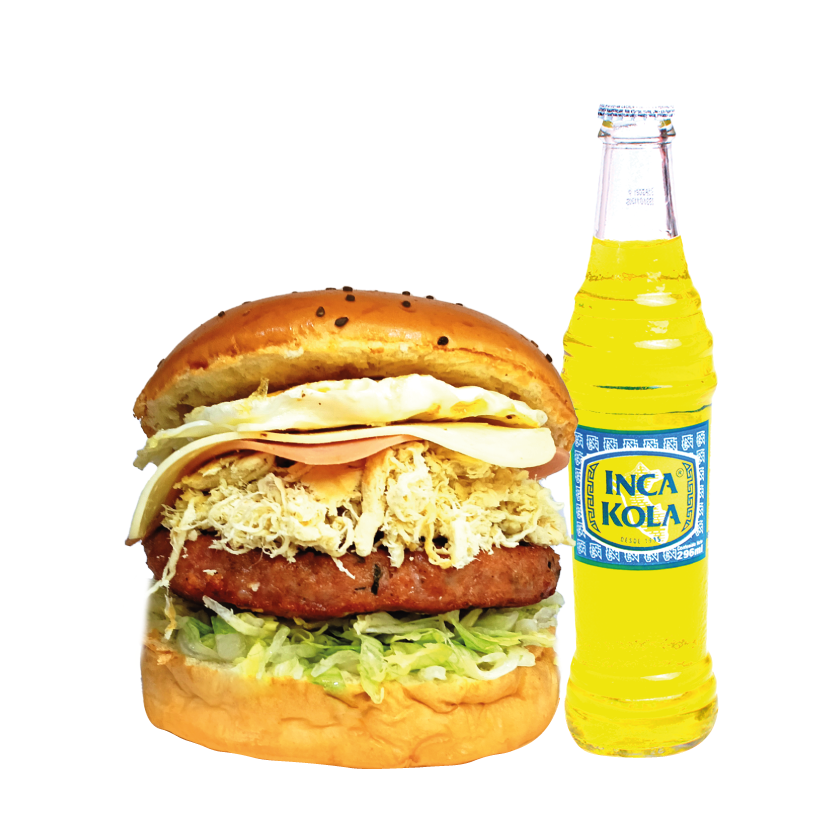 Pollo deshilachado, doble queso, doble jamón, huevo, gaseosa, papas, salsas y ensalada.