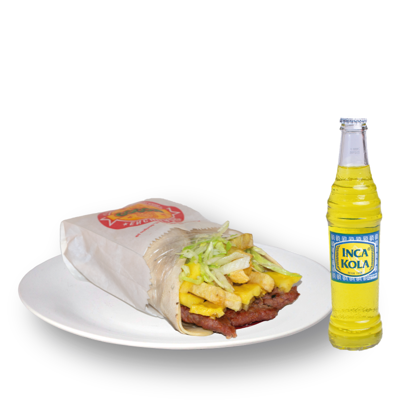 Pollo deshilachado, chorizo, queso, jamón, tocino, gaseosa, papas, salsas y ensalada.