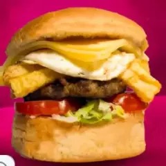 Carne, huevo, 2 queso cheddar, 2 tocinos, papas y salsa.