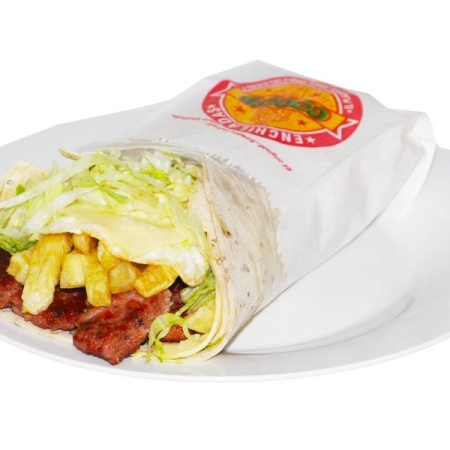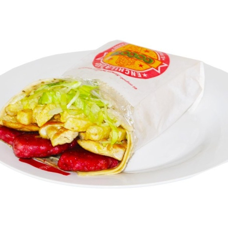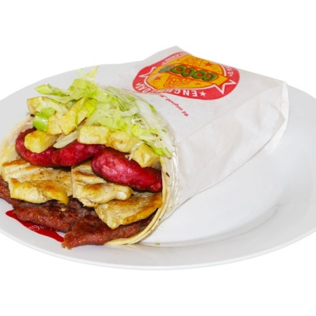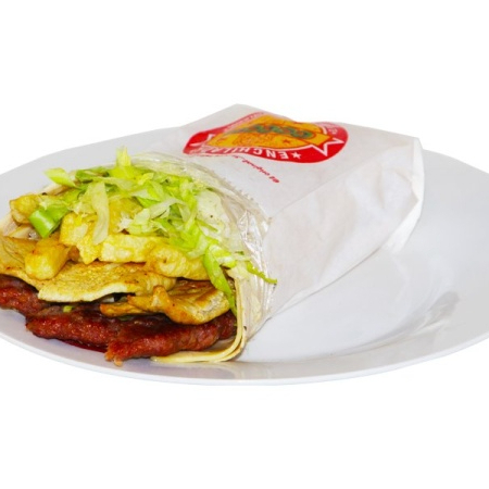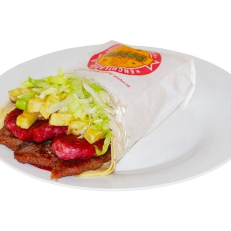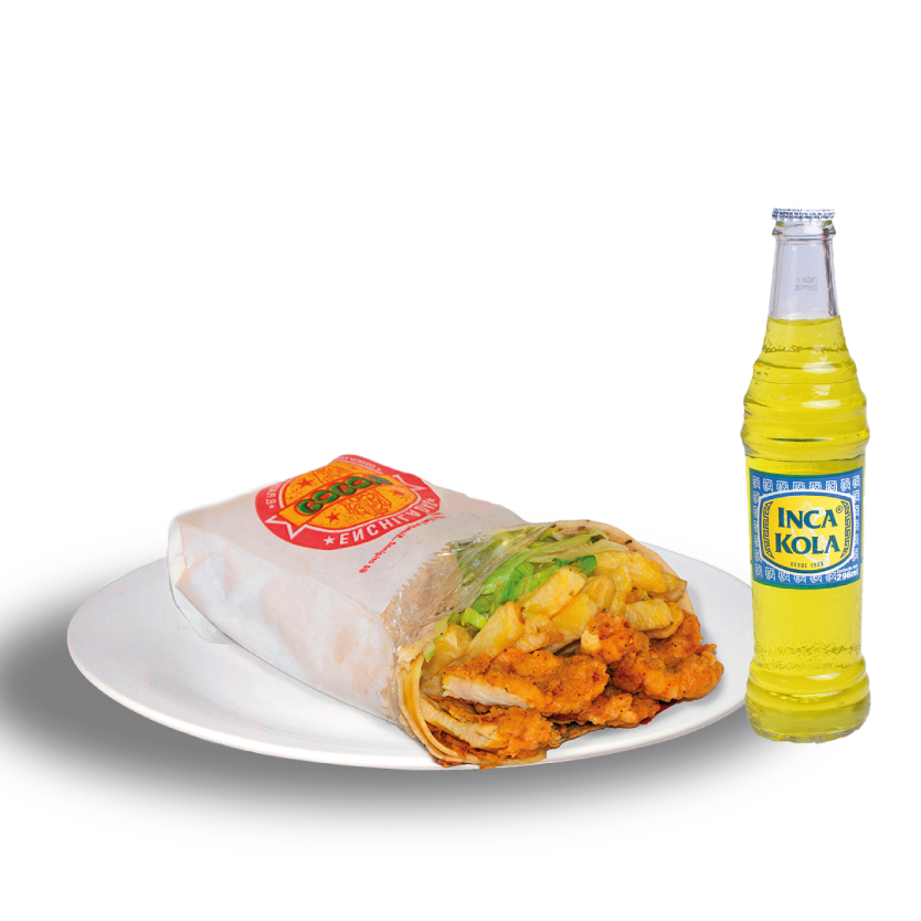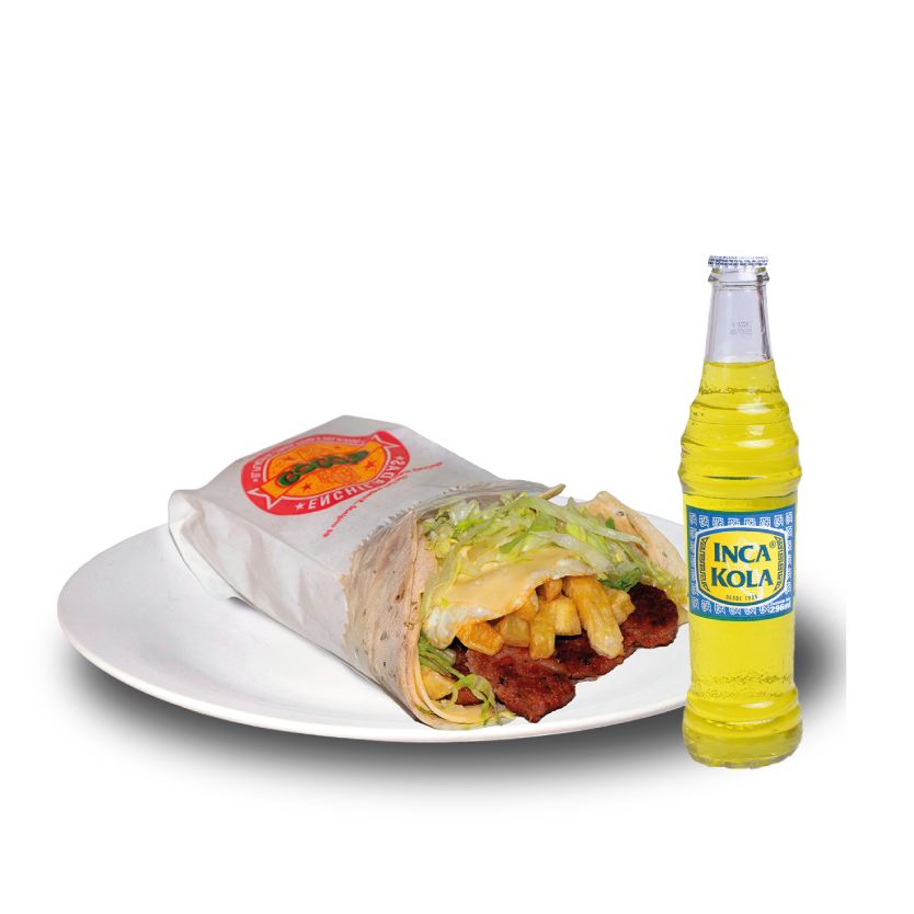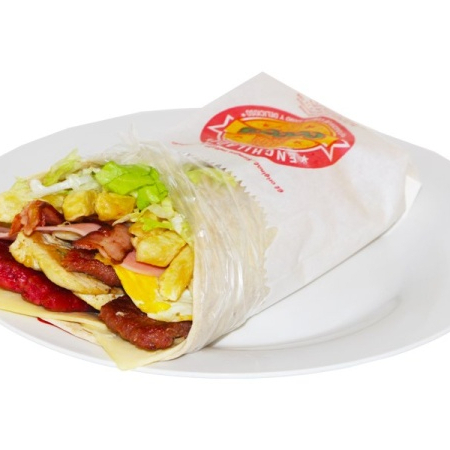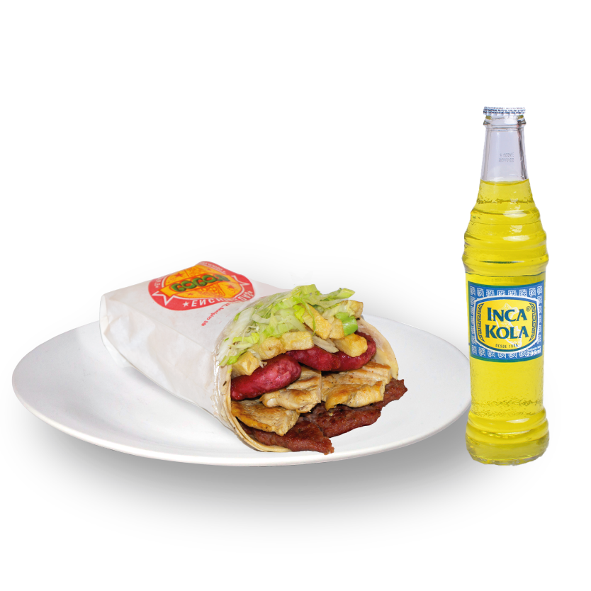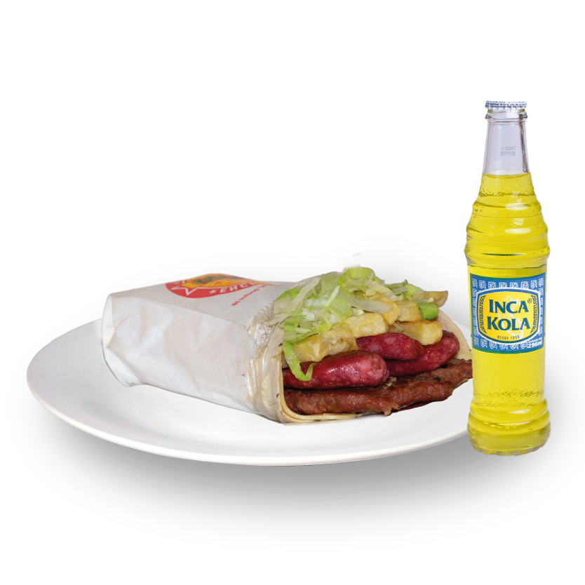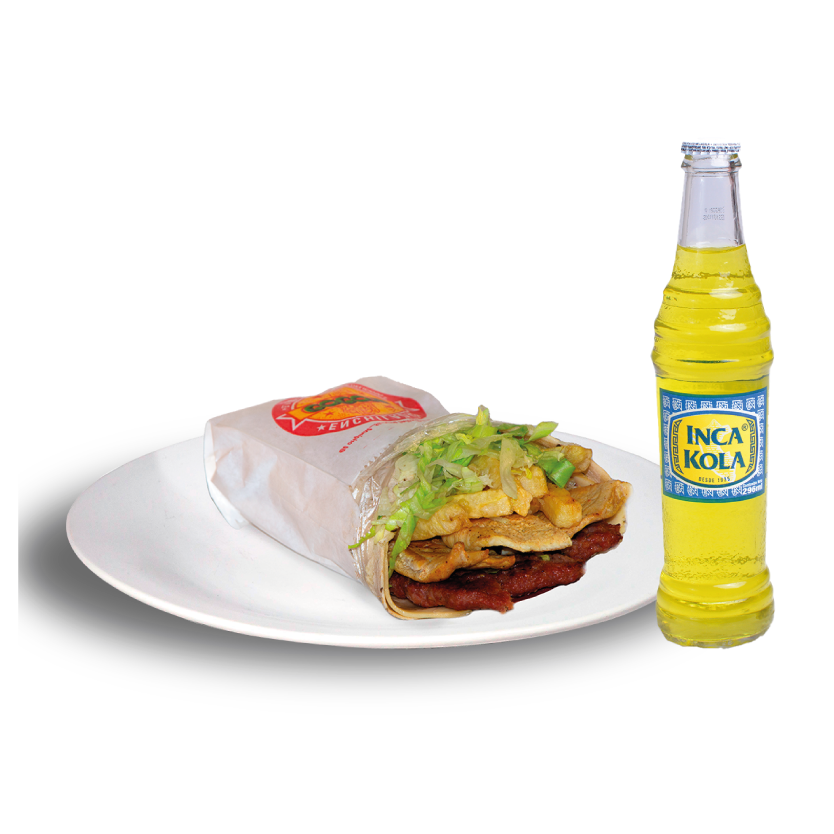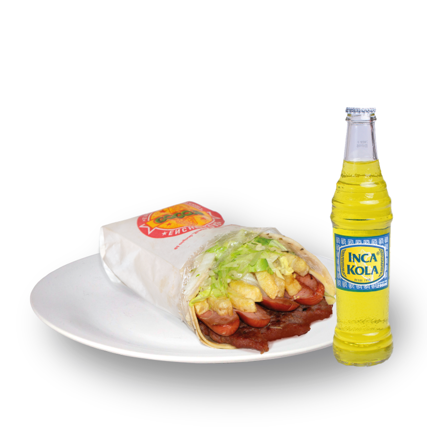 Super enchilada: carne, filete pollo, chorizo, huevo, queso, gaseosa, papa, ensalada y salsas.