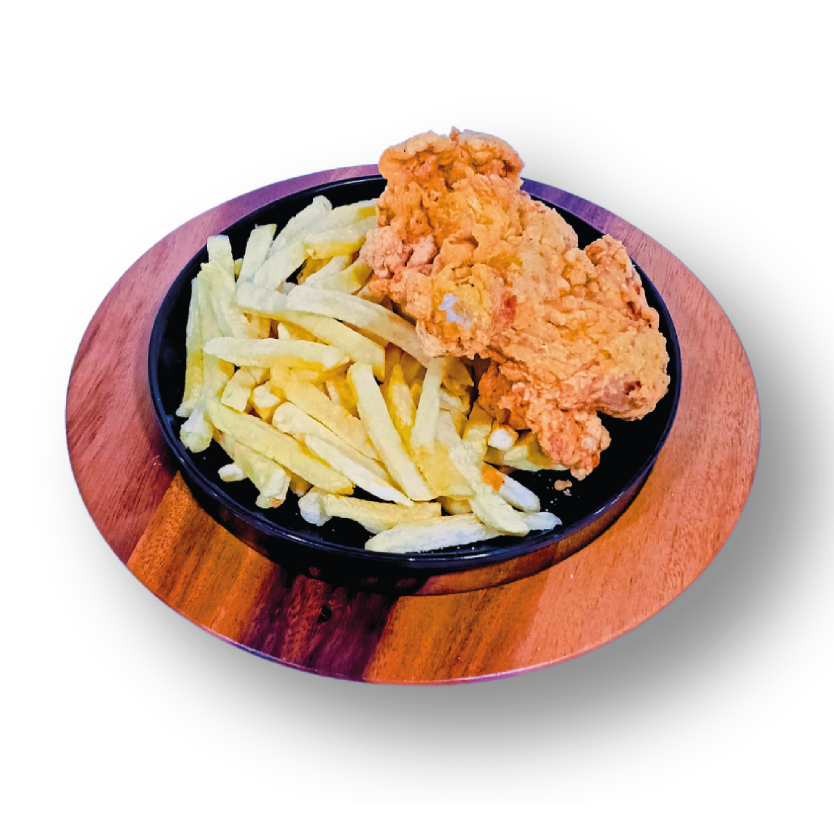 Pecho, encuentro o pierna, papas fritas y ensalada.