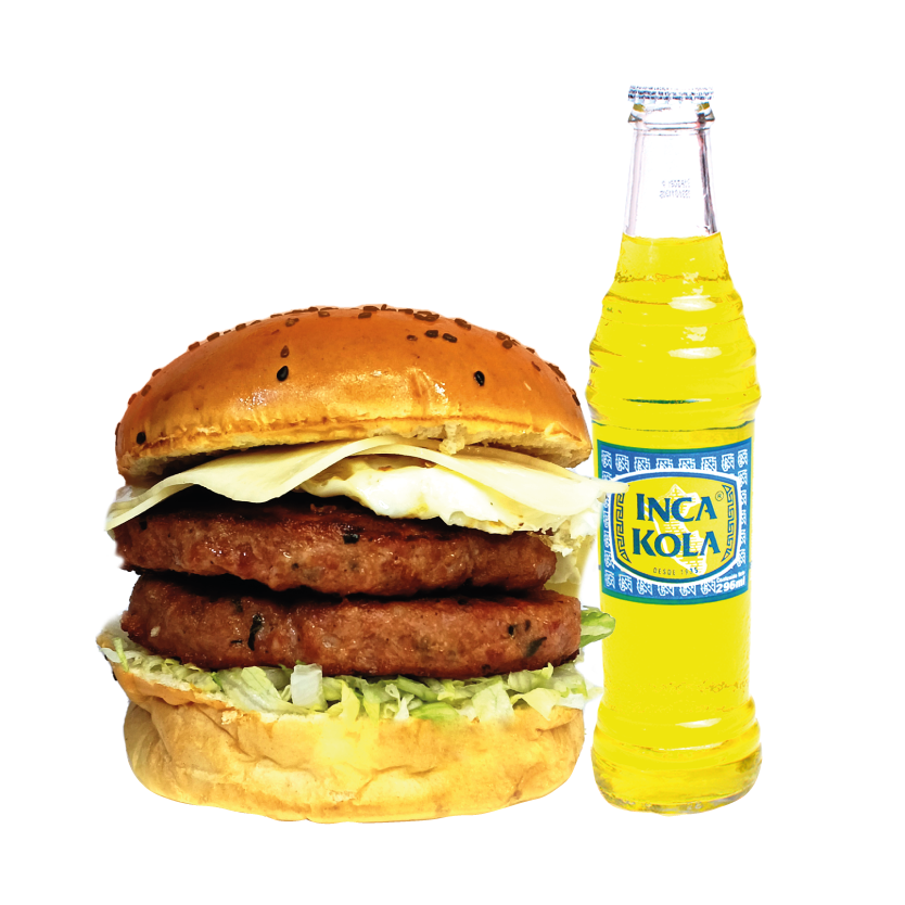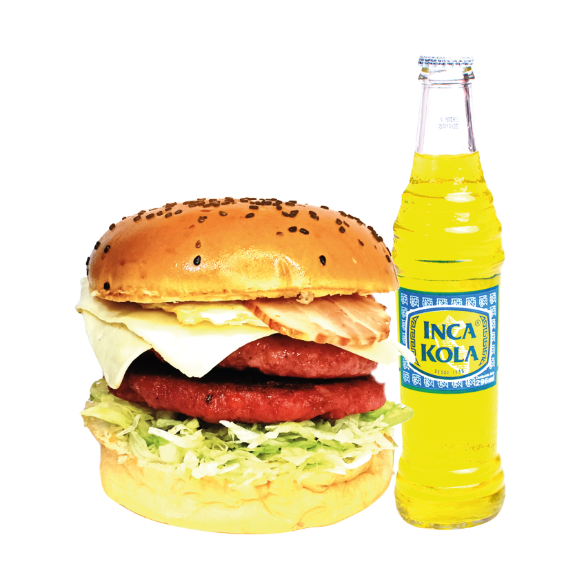 Doble hamburguesa de casa, doble queso, huevo, gaseosa, papas, ensalada y salsas.