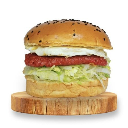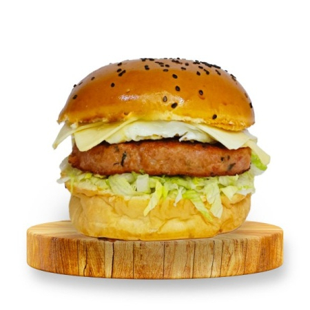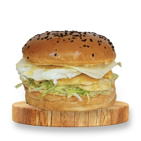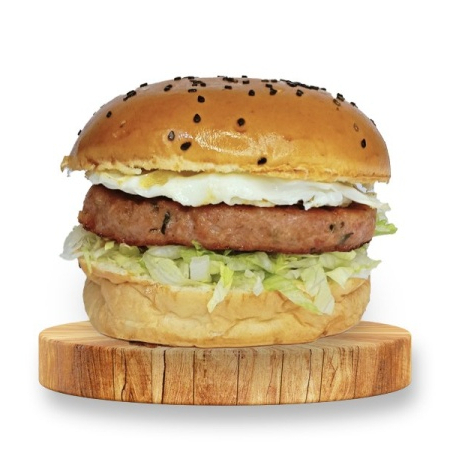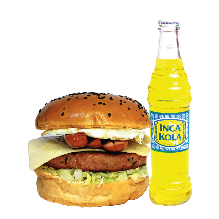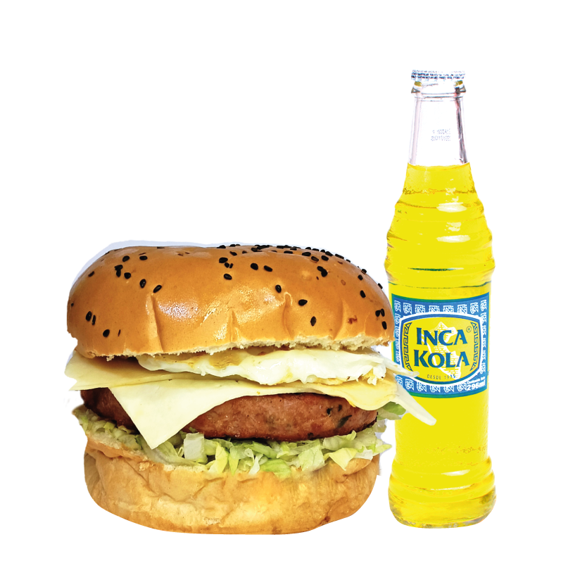 Hamburguesa de casa, doble queso, huevo, gaseosa, salsas, papa y ensalada.