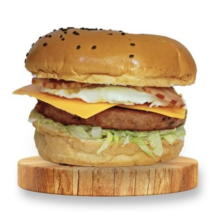 Hamburguesa, queso cheddar, tocino, huevo, gaseosa, papa, ensalada y salsas.